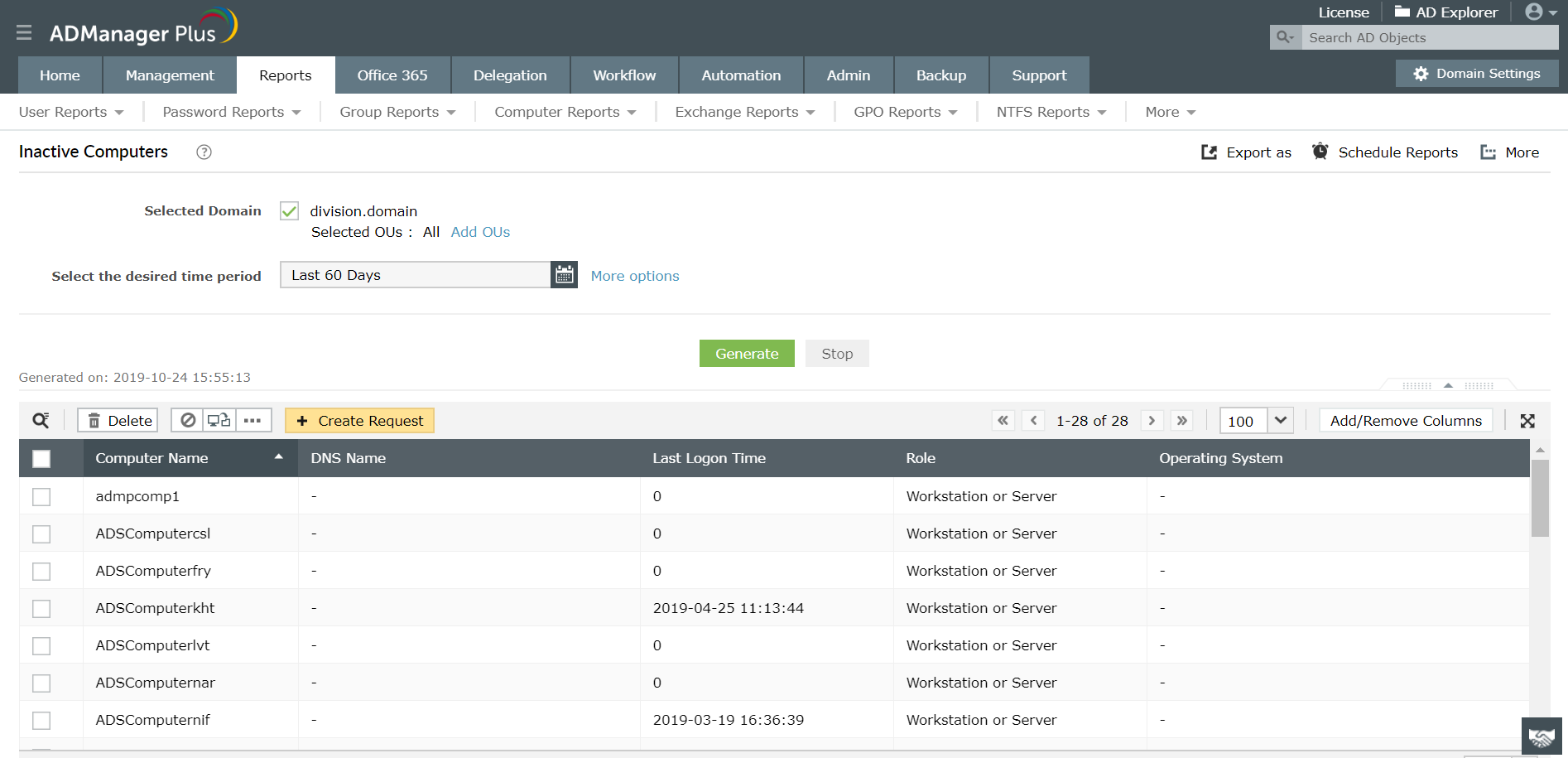 除了不活动的计算机外,您还可以使用ADManager Plus 清理禁用或休眠的用户和计算机。立即下载ADManager Plus并浏览其所有功能!