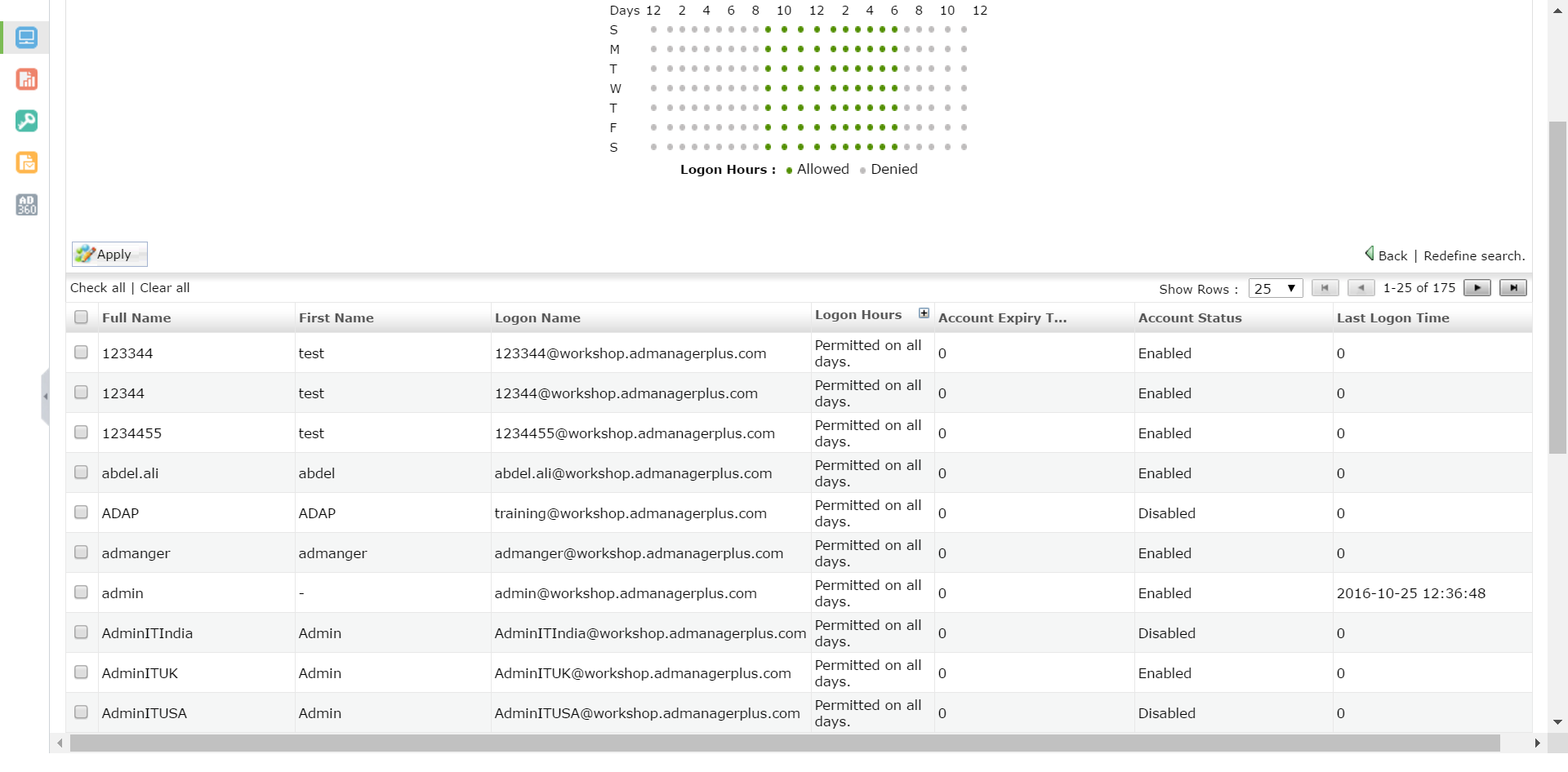 要查看有关Active Directory用户登录时间的详细报表,请将搜索字段留空,然后点击搜索。该报表将为您提供信息,包括用户的全名,名字,登录名,登录时间,帐户状态和最后登录时间。您还可以通过在搜索字段中输入特定用户的名称来查看对特定用户的限制。