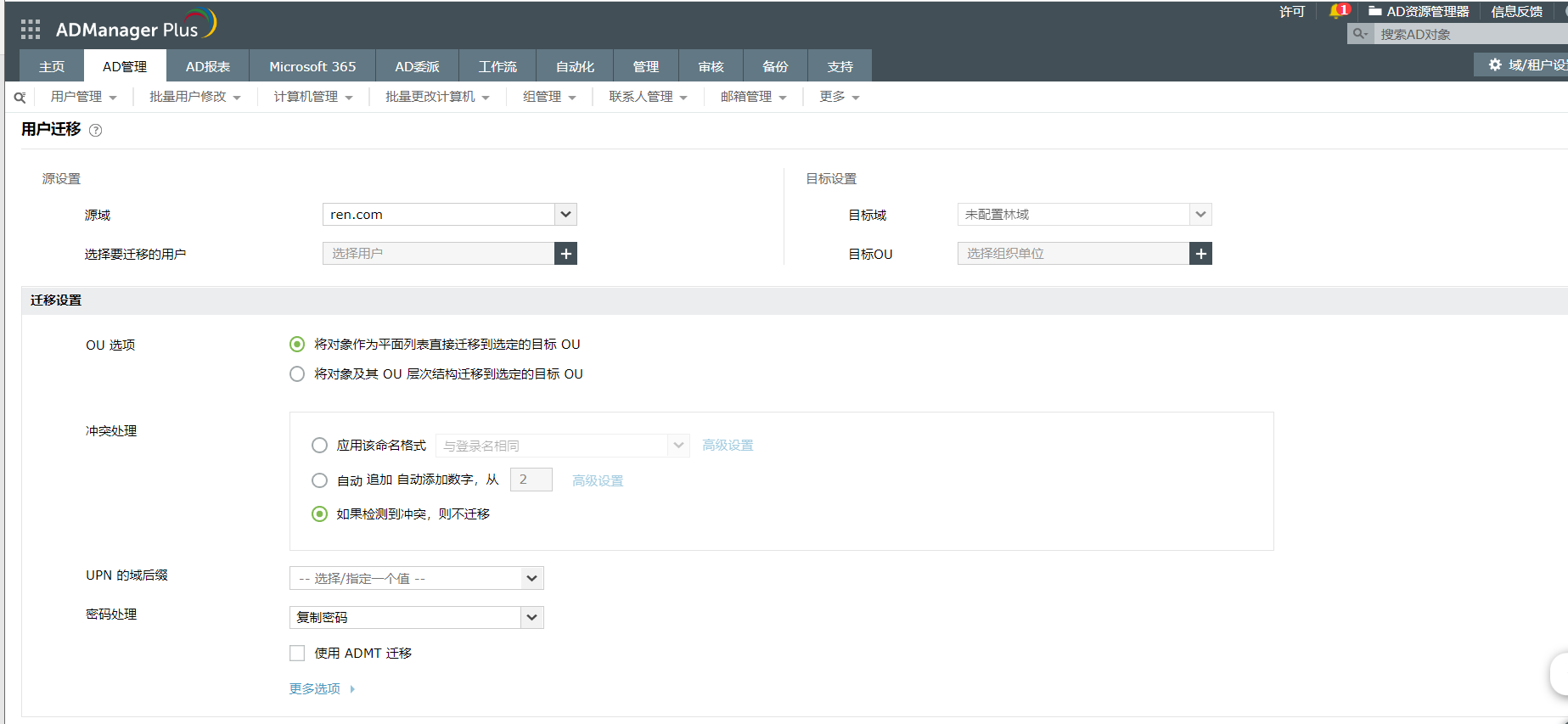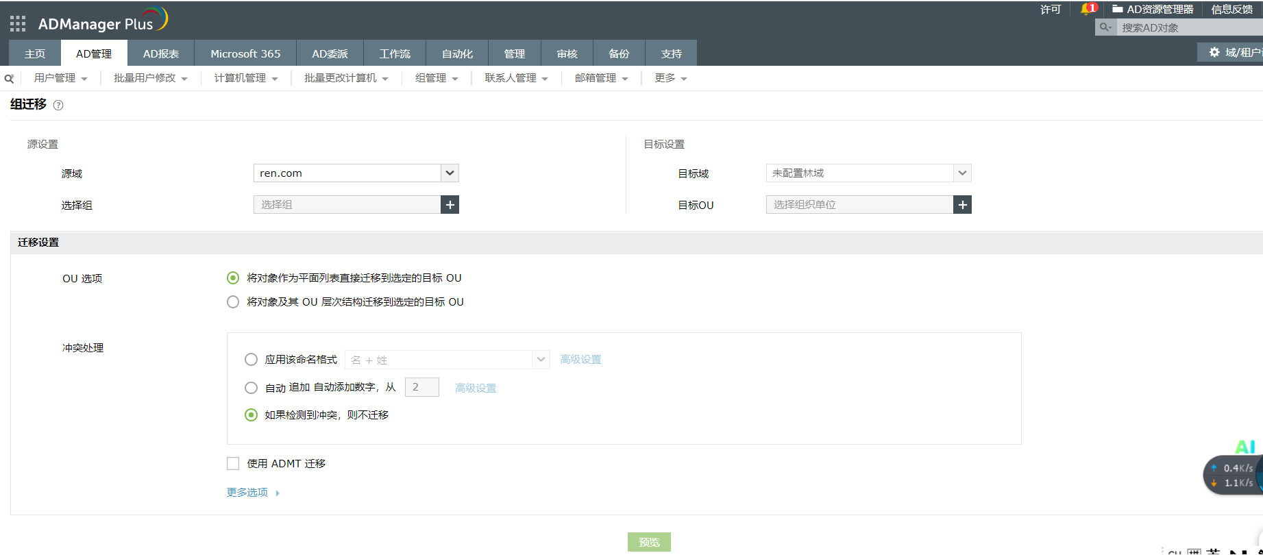 ADManager Plus可以为安装了 Microsoft Active Directory 迁移工具 (ADMT) 的企业突破原有的局限而获得更好的迁移体验。凭借ADManager Plus的GUI功能,只需单击几下,可确保顺利、无忧的完成迁移。它不仅可以完好无损地将对象、属性及其配置迁移,又可以帮助企业很好地避免了发生迁移错误的情况。ADManager Plus还具有高度的伸缩性,即使是大量AD对象的迁移,也不会影响AD性能和运行状况。