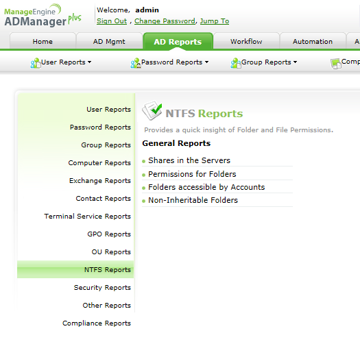 <p利用ADManager Plus的NTFS权限管理模块,管理员可以批量控制和整理NTFS文件权限,因此让整个环境变得更有效率和安全。>