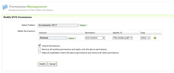修改NTFS权限 - 此选项让您可以更改本地和网络上的那些文件和文件夹的NTFS权限。您只需要选择相关文件或文件夹、所需的用户或组、权限(完全控制、读取等)及其类型(允许/拒绝)。您可以阻止或执行继承,甚至可执行父文件夹上设置的权限,以便应用到所有子文件夹。修改任何文件或文件夹的NTFS权限就这么简单,只需点击几下鼠标即可完成。