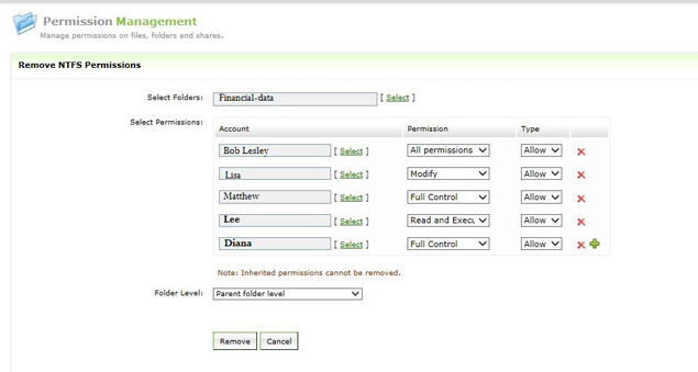 撤销NTFS权限 - 用户所拥有的本地文件和文件夹以及网络上的文件和文件夹的权限可使用此选项轻松地批量撤销,只需执行几个简单的步骤即可。您只需选择需要撤销其权限的文件夹、用户或组、权限级别以及是允许还是拒绝所选的权限。您也可以选择必须撤销其NTFS权限的文件夹级别(父文件夹、子文件夹等)。