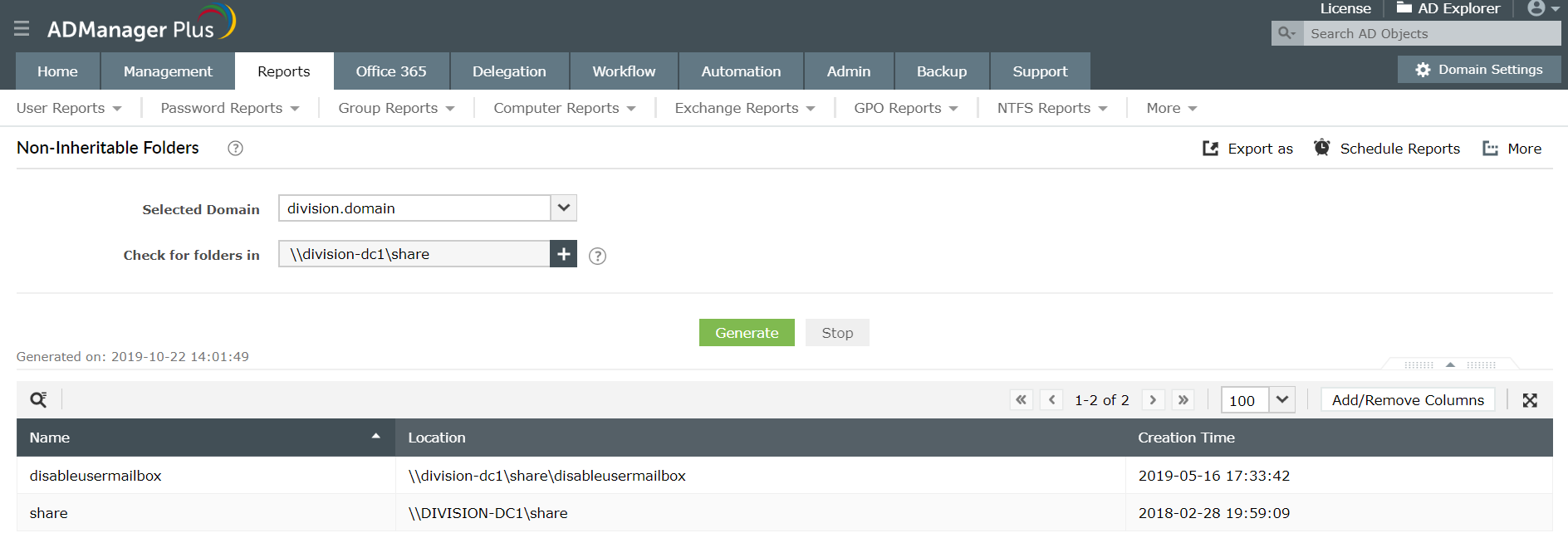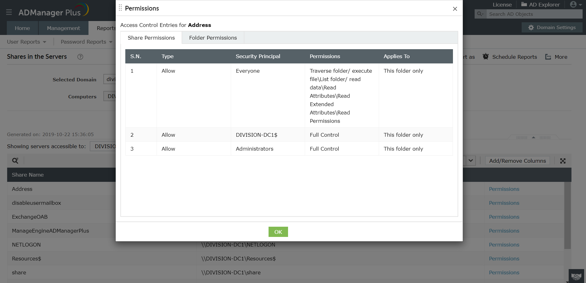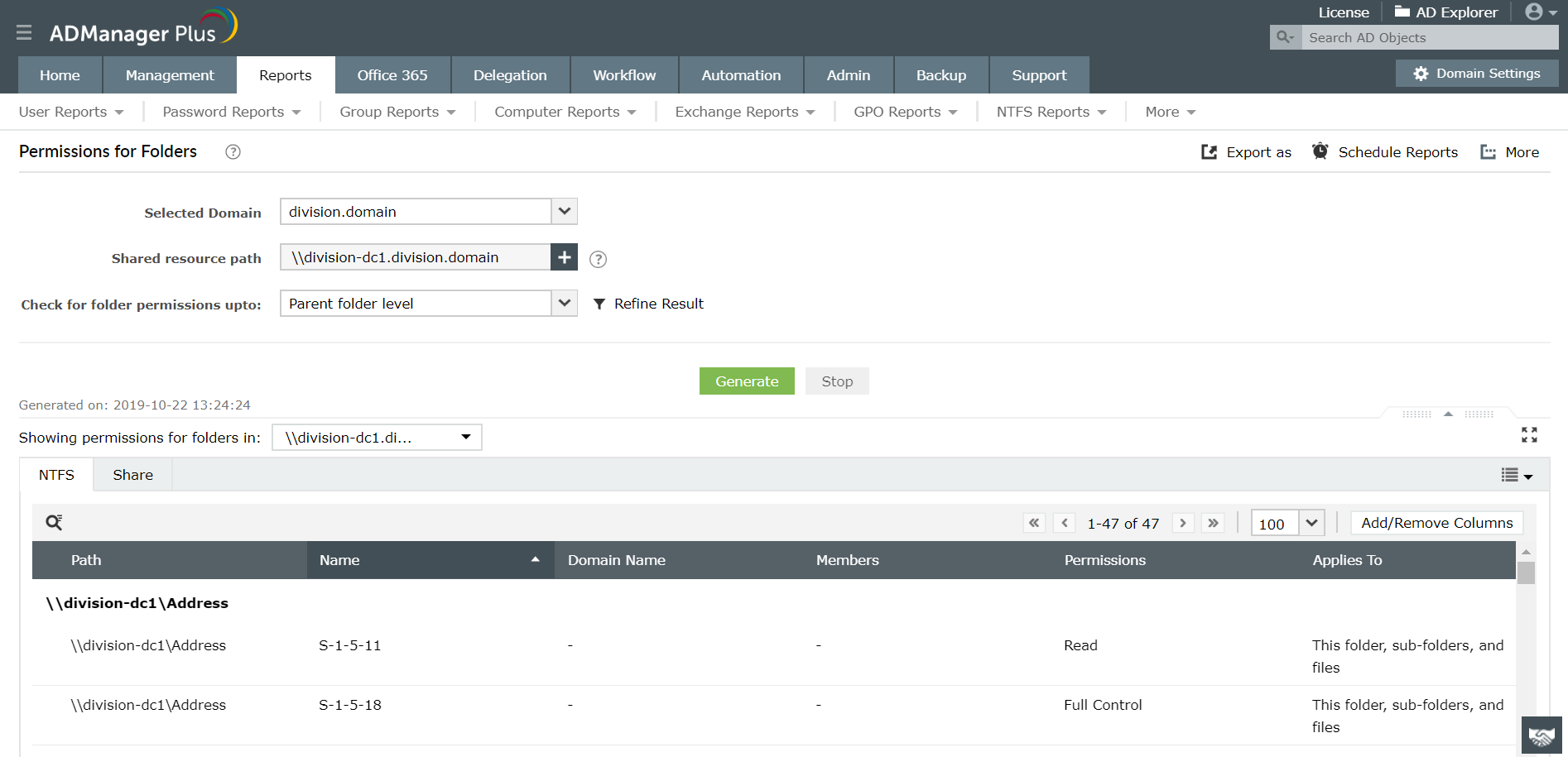 ADManager Plus是我们的Active Directory管理和报表解决方案,可以兼用作共享文件夹权限报表工具。它提供预定义的报表,以查看,分析和修改NTFS并共享分配给Windows或NetApp服务器,文件夹和文件的权限或ACL。