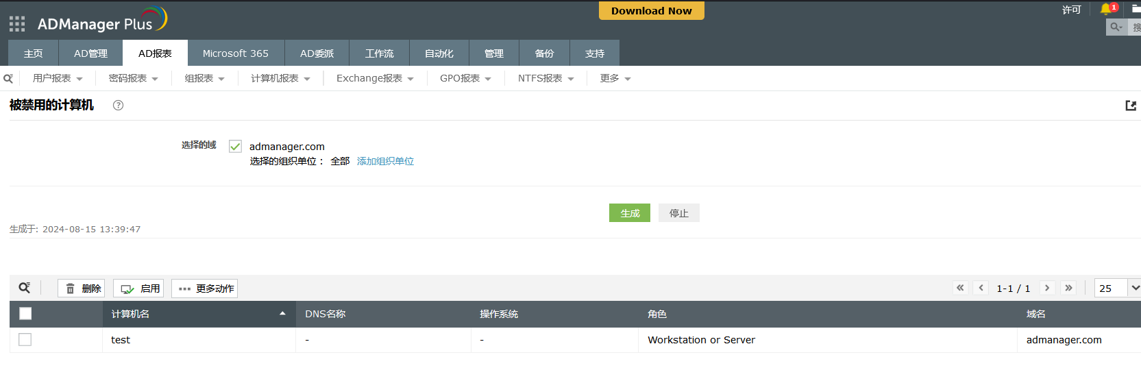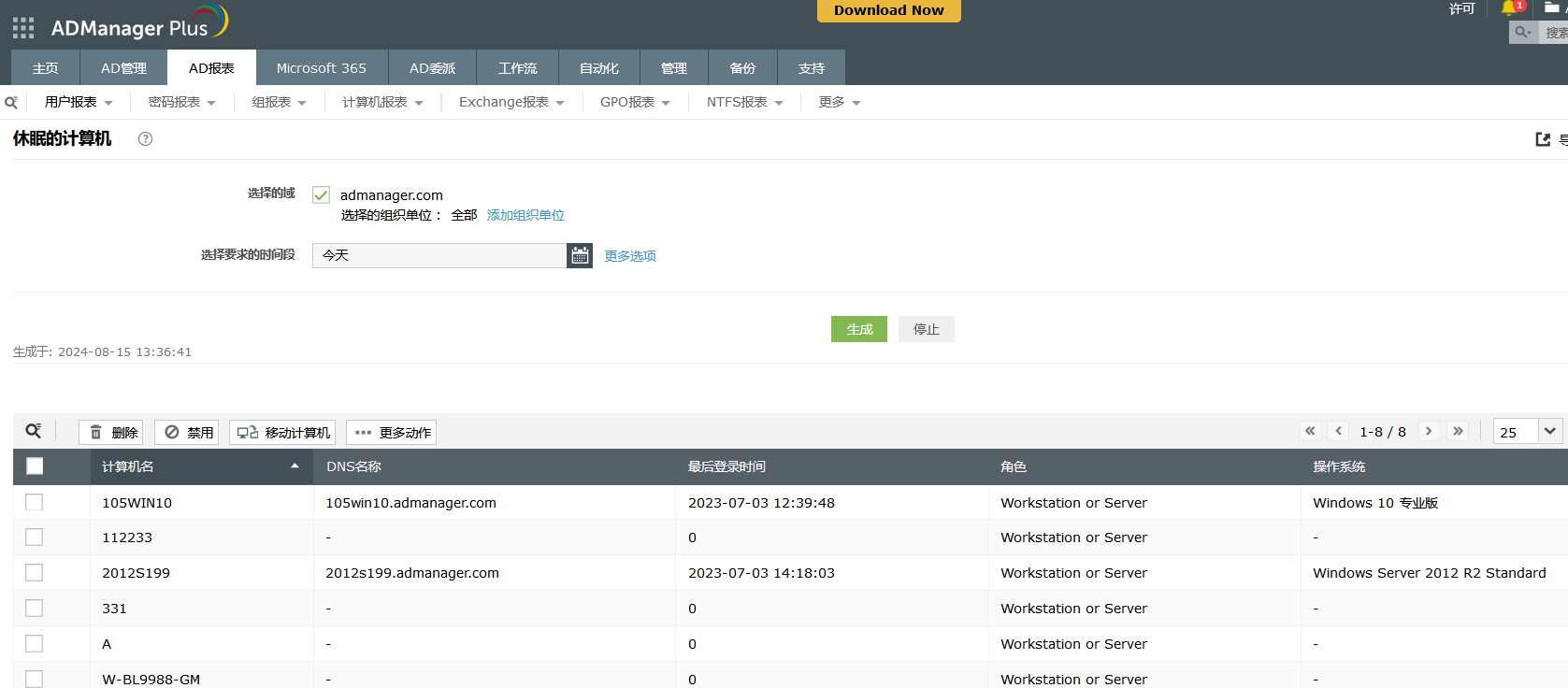 AD域(活动目录)计算机报表让管理员对域中的计算机对象有全面的了解。利用这些也可以事先配置好的报表,您可以减少麻烦,不用再编写脚本以手动提取所需的所有计算机特定信息。