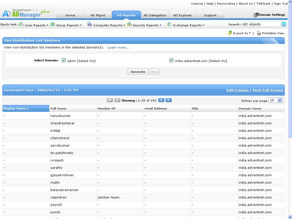 您可免费下载、基于Exchange功能的报表等),以便快速了解通讯组列表和非通讯组列表中的用户和成员的Exchange属性。这有助于管理员验证成员以及将成员更新到通讯组列表或从通讯组列表更新成员;查看代理地址、电子邮件地址、邮箱存储、收件人设置、POP3等。另一个巨大的优势是,所有这些报表都可为多个版本(即Exchange 2003、2007、2010、2013和2016)生成。