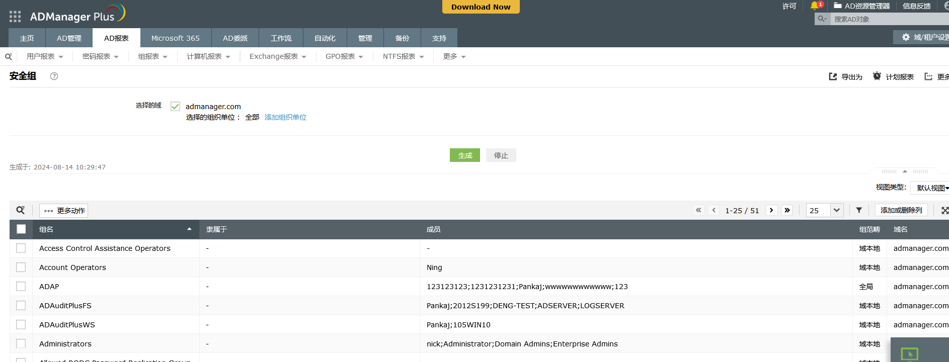 与本机Exchange工具、PowerShell等不同,ADManager Plus提供以下现成的基于组的报表,包括最近创建、修改或删除的组,您可自动或在需要时生成和导出报表: