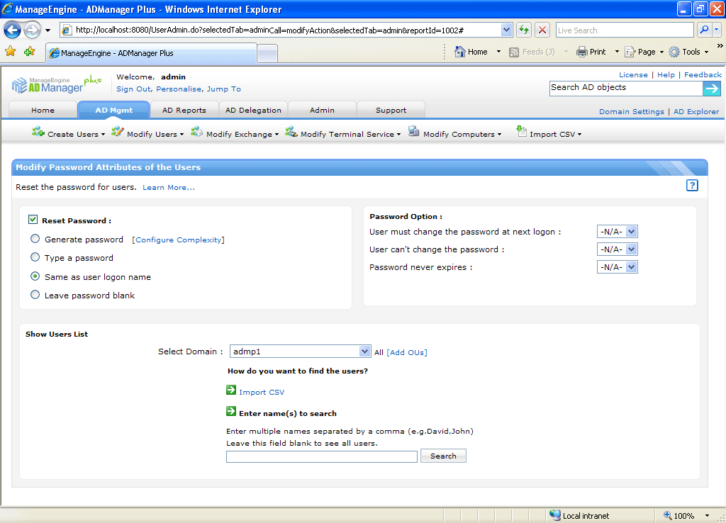 ADManager Plus有一项内置的专用功能,可从您的域中的一个集中位置管理单个/多个用户密码,旨在减少问题。管理员或已分配的帮助台技术员可从CSV文件导入需要重置密码的单个/批量用户的列表,只需点击一下即可为整个用户列表重置密码。除此之外,他/她还可对Active Directory中的密码和用户账户的密码管理执行下面的一组操作。