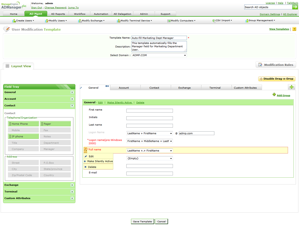 除了‘修改规则’,修改模板的另一个亮点是其‘拖放’自定义组件。这个自定义功能让您可以根据需求准确地配置用户、联系人和组修改模板。使用简单的‘拖放’操作,您可以仅在模板中放置所需的属性。