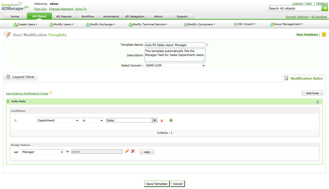 使用修改规则,您可以在修改模板中指定一组条件,每当使用该模板修改AD账户时必须评估这些条件。在用户/组/联系修改过程中,如果满足条件,则AD账户的相关属性将自动使用修改规则中指定的值来更新。