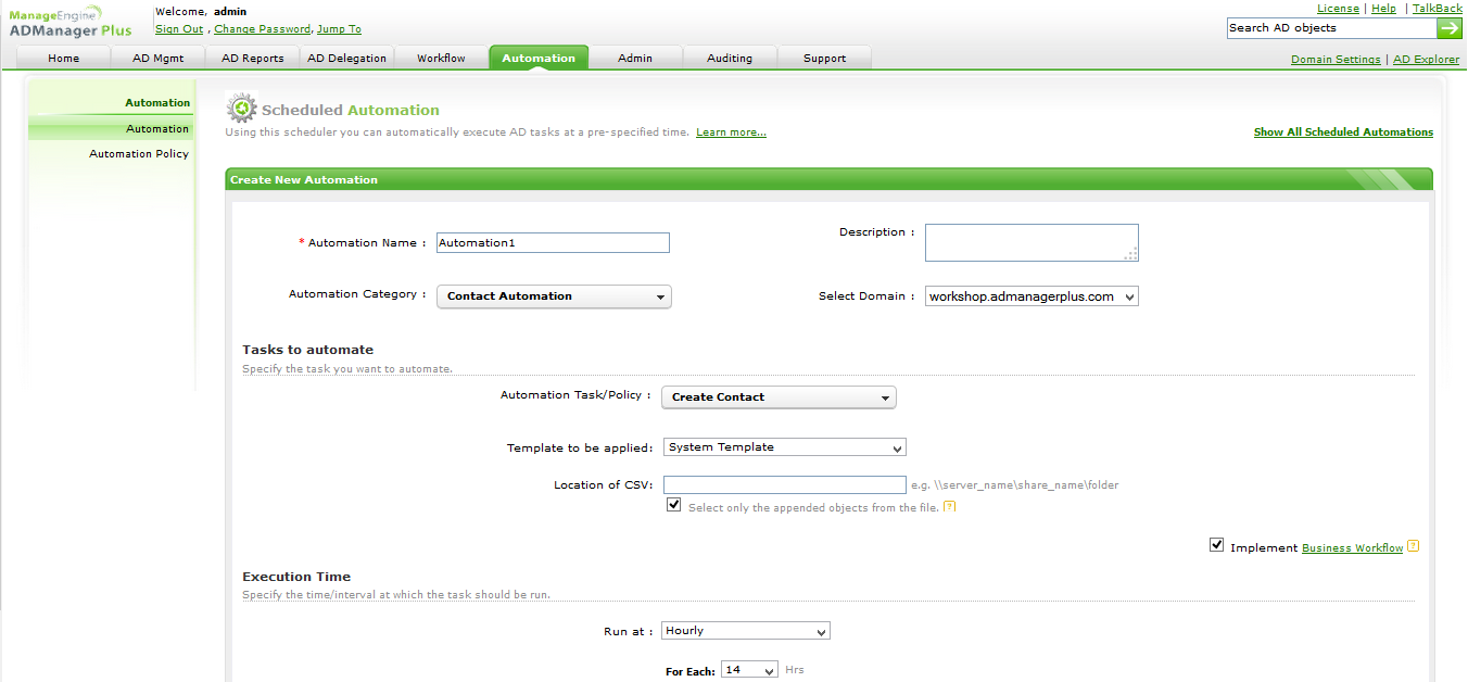 作为一种自动化工具,ADManager Plus提供了用于创建和删除联系人的自动化功能,如图4所示。只需输入CSV文件的网络位置,其中包含必须创建或删除的联系人的详细信息。选择时间间隔以指定必须执行自动化任务的时间。您可以每小时,每天,每周,每月或一次安排一次自动化。