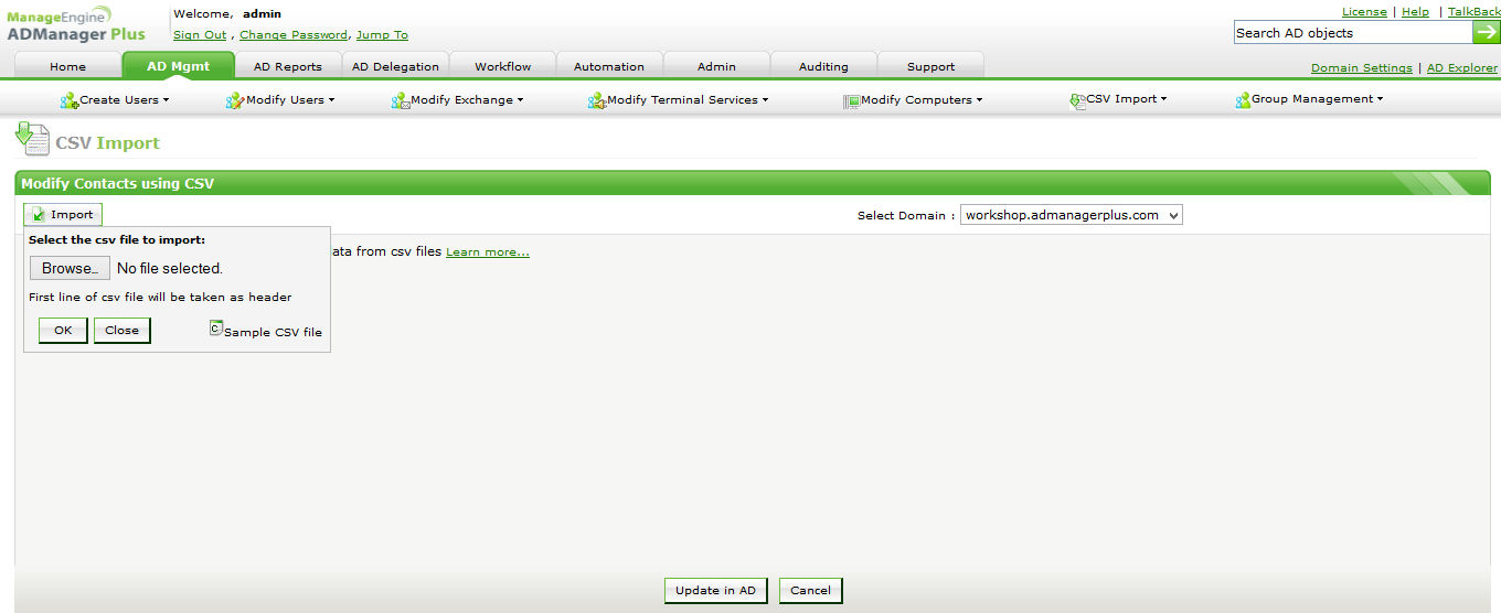 其他ADManager Plus功能(例如自动化和委派)也支持通过CSV文件导入联系人对象的功能。