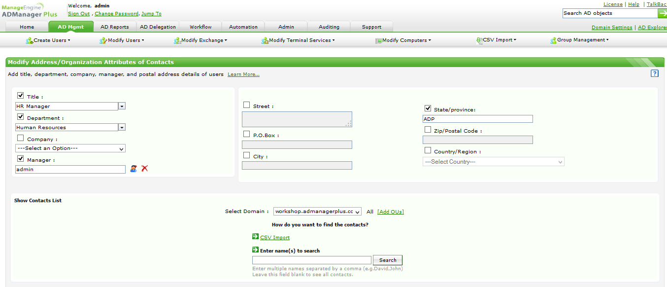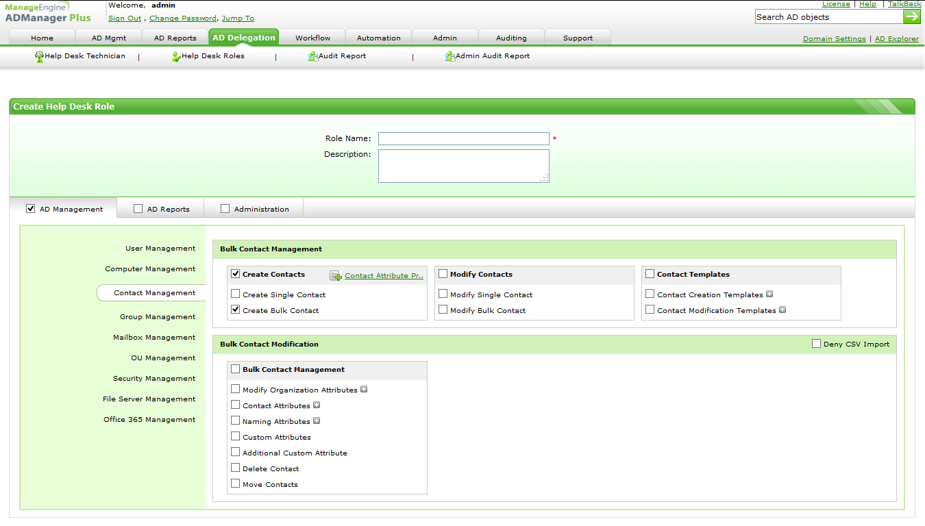 ADManager Plus使您可以将联系人的创建或修改委派给非管理员,例如服务台技术人员或HR人员(图5)。您可以指定组织单位(OU),代表可以在其中执行其分配的任务。您可以使代表通过CSV导入选项单独或批量管理联系人。您甚至可以指定代表可以为其分配值的属性。