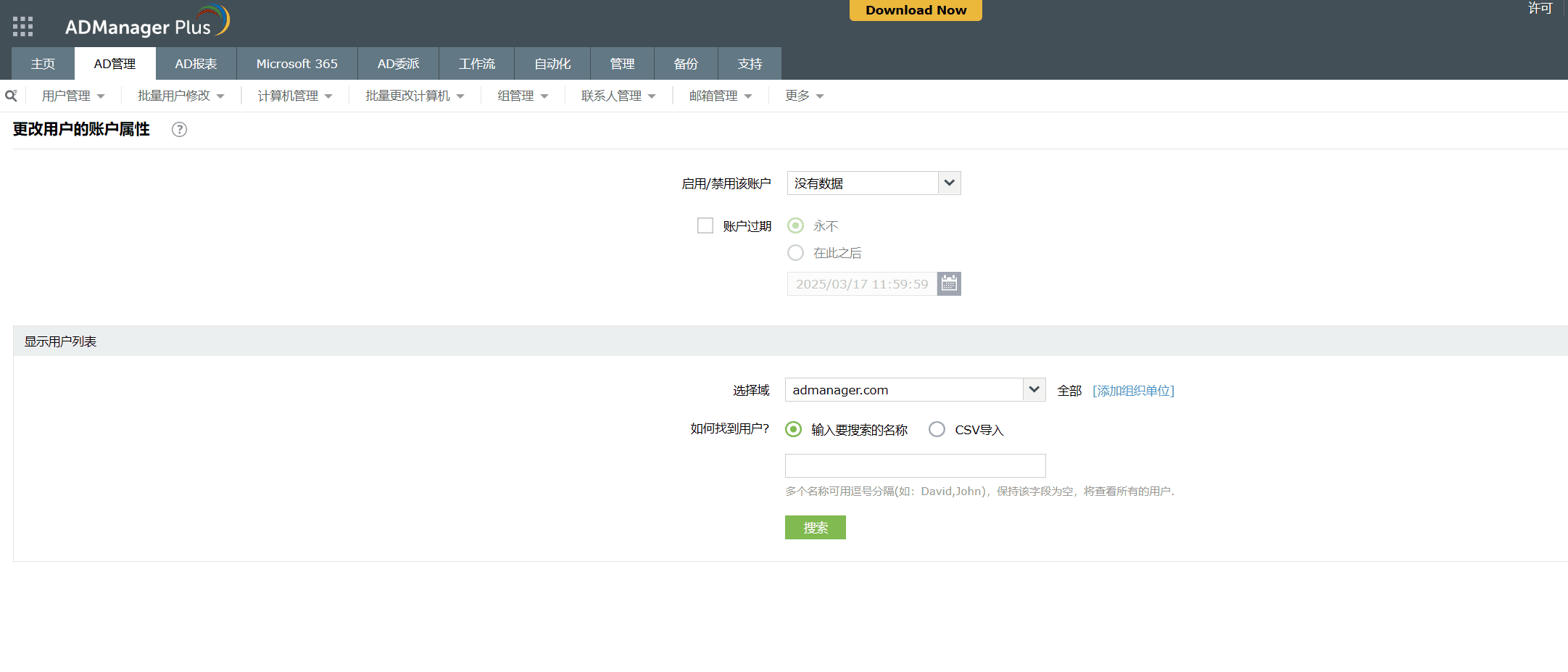 在某些情况下,用户帐户可能会在常规安全检查期间意外禁用,这可能会影响整体业务生产力。ADManager Plus允许您批量管理禁用的Active Directory用户,而无需使用PowerShell或Active Directory用户和计算机(ADUC)等传统的Active Directory管理工具。您只需上传包含禁用帐户列表的CSV文件,并一次性启用它们。此外,您可以从特定域或组织单位(OU)生成禁用用户的列表,并直接从报表中启用它们。