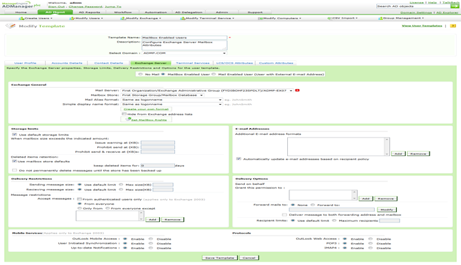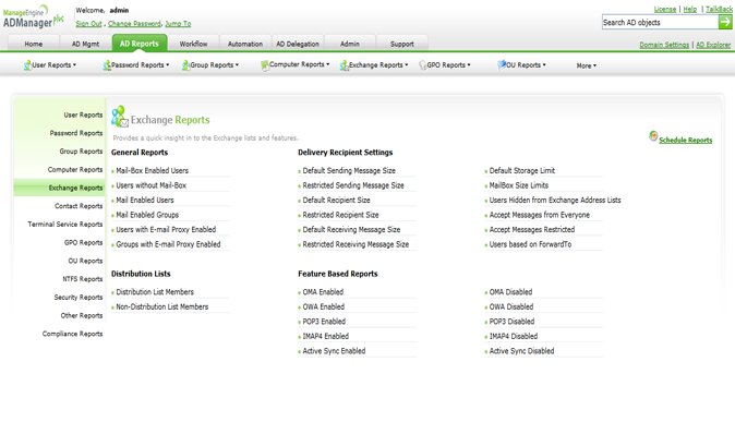 ADManager Plus让您可从一个基于Web的控制台管理和监控Exchange Server,具有最大灵活性和便利性,可管理多个版本(Exchange 2003、2007、2010、2013和2016)。它还通过其预制报表(例如,邮箱报表、通讯组列表报表)来简化Exchange Server报表。与多个控制台和Powershell脚本作斗争现在已成为历史!