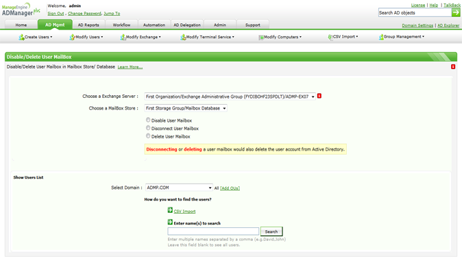 此功能帮助您一次性批量禁用或删除用户的邮箱。您要做的是:使用此功能的内置搜索选项找到其邮箱必须删除的用户,或通过CSV文件指定用户列表,以便为所需的邮箱解除配置。