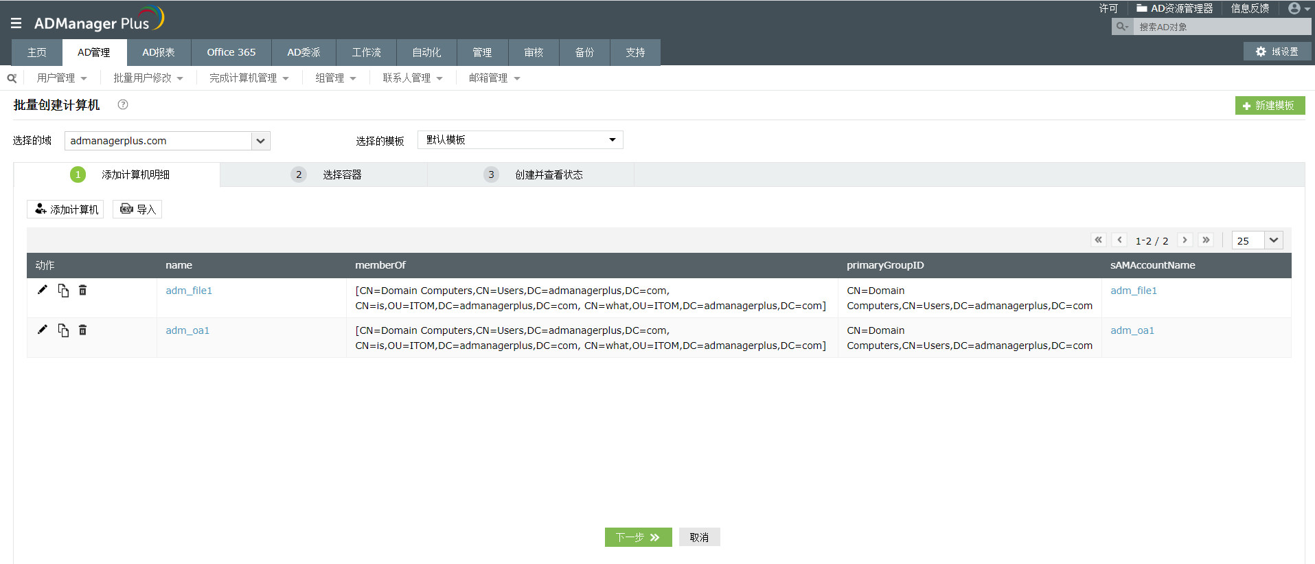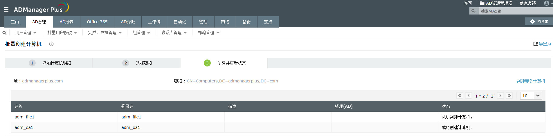 使用本功能,可以批量创建计算机帐户。这些计算机可以登录到域,访问网络资源。
