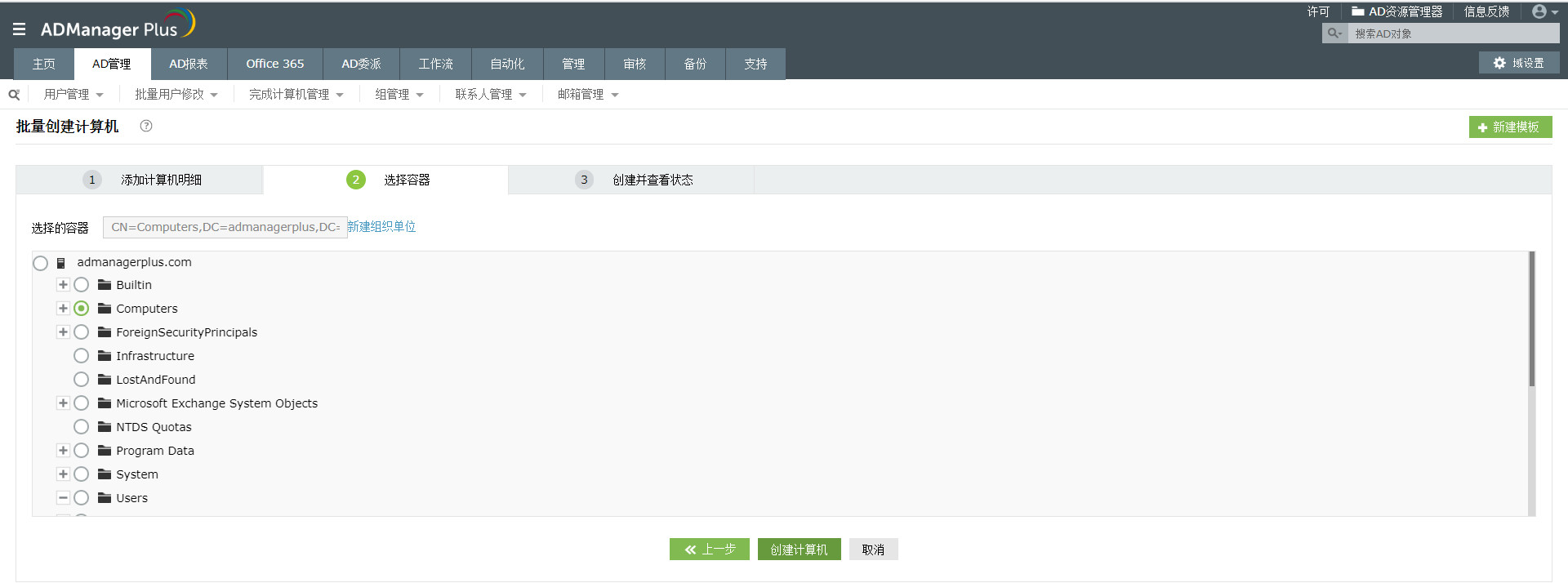 要批量创建计算机,首先要选定域,再选择要导入的CSV文件,然后选择要创建的计算机所属的容器即可。