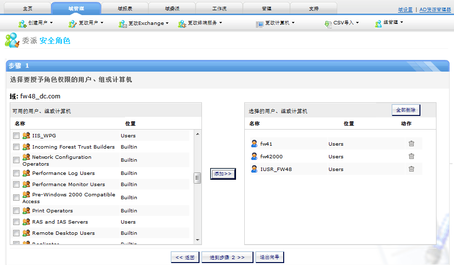 选择的域的所有可用的用户、组或计算机都将在这里列出,选择要委派的安全主体(用户、组和计算机),点击添加按钮。
