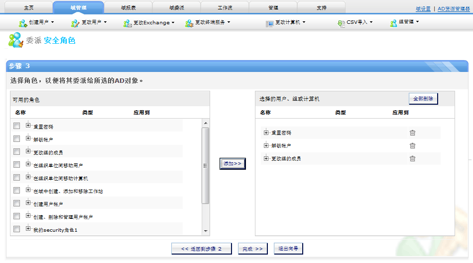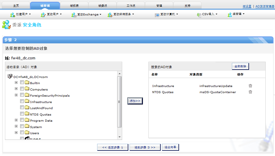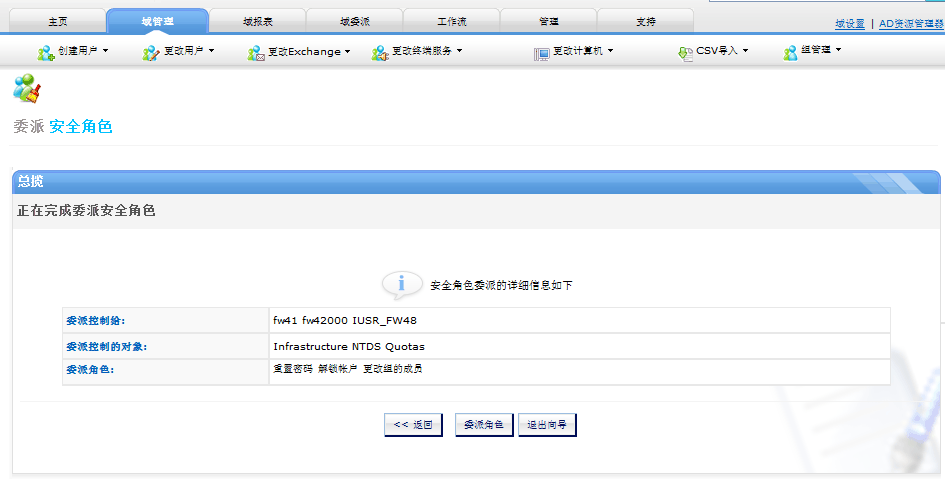 选择AD管理页签,选择安全管理,点击委派安全角色链接,打开委派安全角色向导。