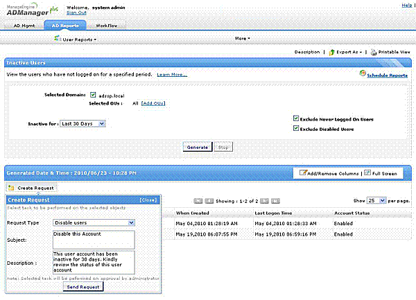 请求人登录到ADManager Plus - -> 生成非活动用户报表