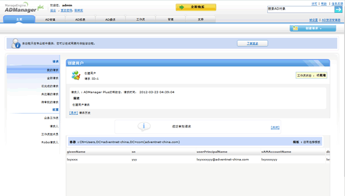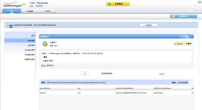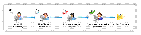公司人事部新招聘了一个员工,并提交一个请求,请求在活动目录中为该员工创建用户帐户。人事主管会审核该请求并提交给部门经理进行审批。部门经理批准后,系统管理员将会创建此用户。