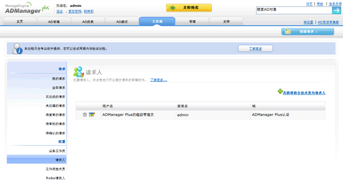 使用请求人登录到ADManager Plus - -> 点击工作流标签