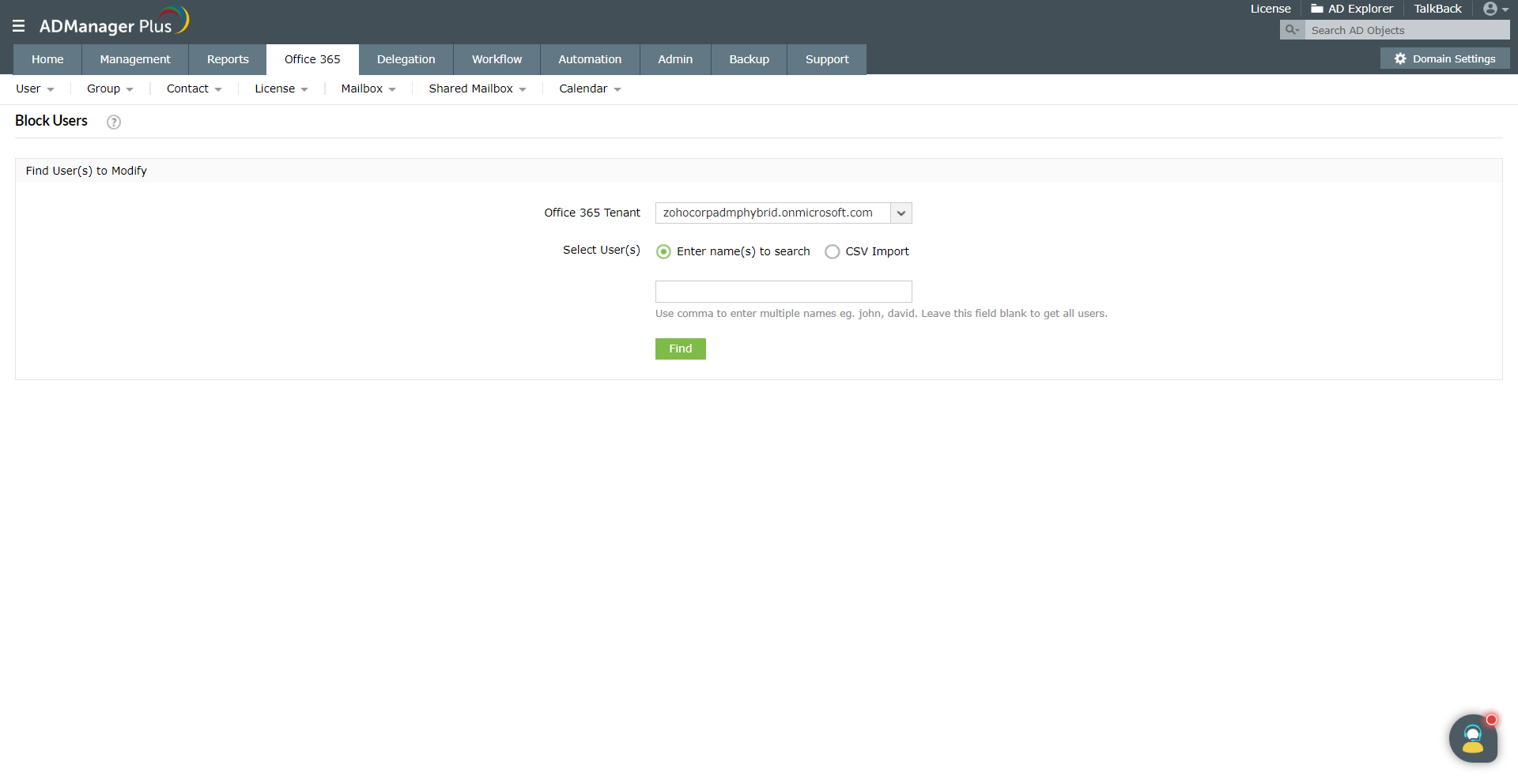 如何使用ADManager Plus阻止或取消阻止Office 365帐户: