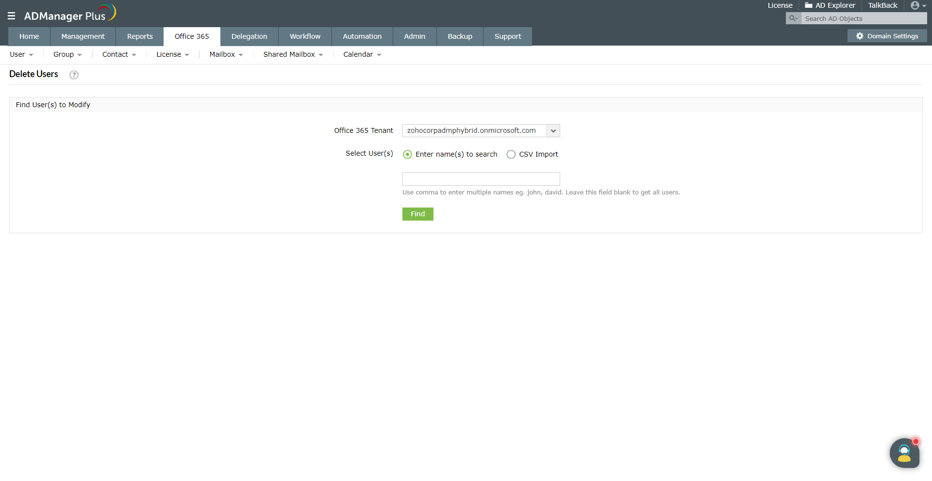 使用ADManager Plus,只需单击几下即可删除Office 365用户帐户。您还可以使用“ 删除/禁用策略”在删除用户的相应AD帐户时删除或禁用Office 365帐户。