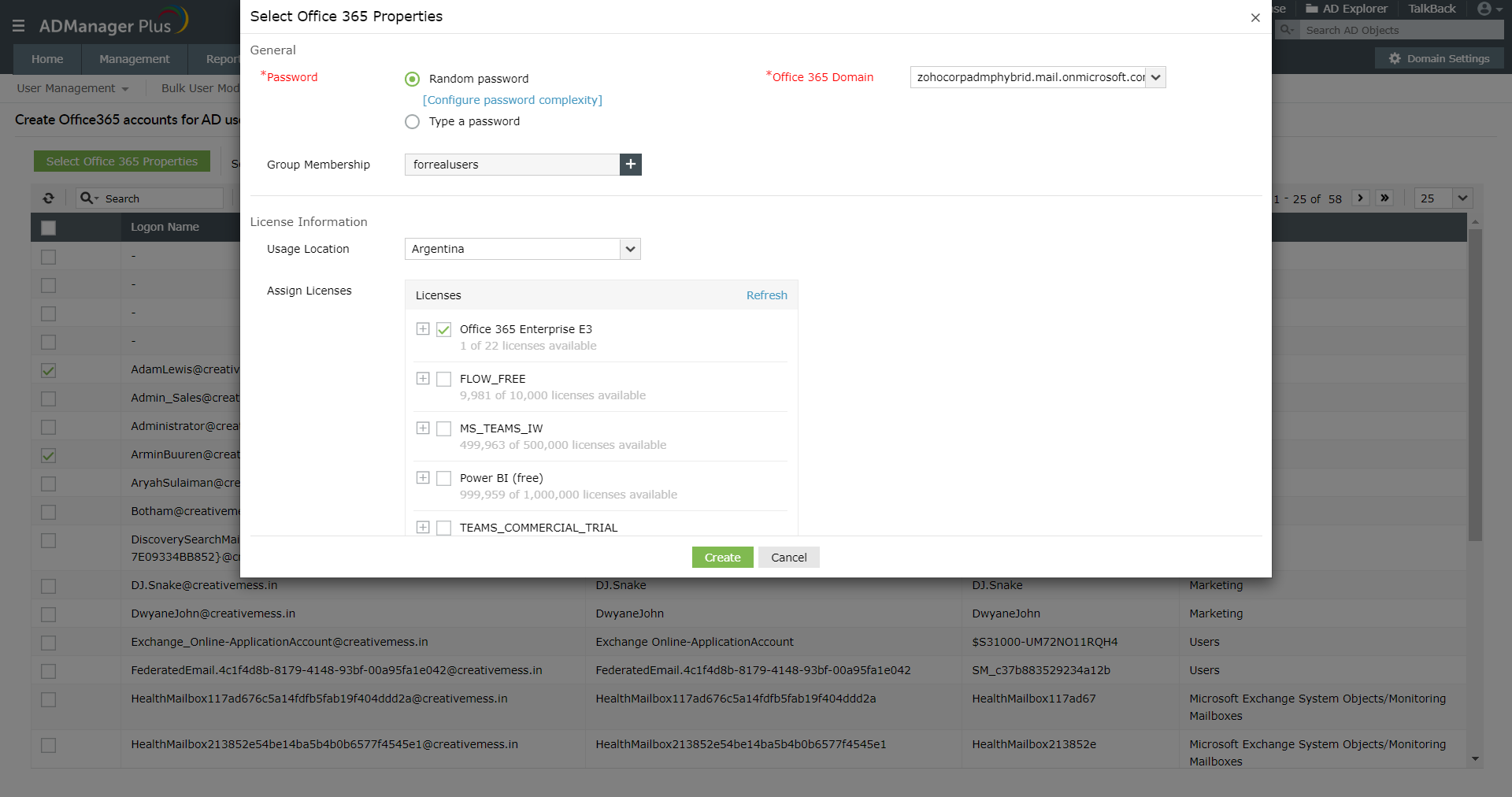 ADManager Plus使您可以使用预定义的操作为现有AD用户创建Office 365帐户。