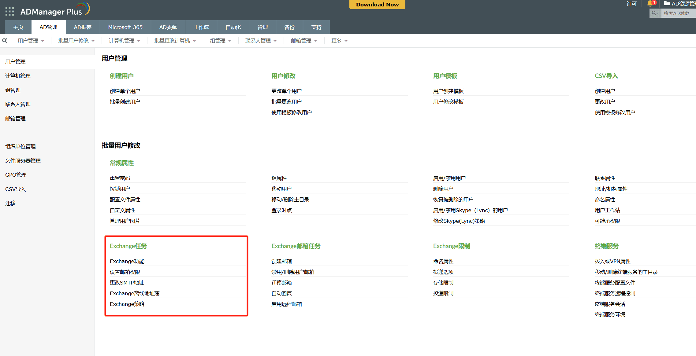 除上述任务外,此基于Web的工具还加载了一些功能,以帮助您管理电子邮件的传递选项,传递限制,并为用户分配Exchange脱机通讯簿。除了Exchange Server管理外,此工具还可以通过其预定义的任务模板(用于常规和重复的Active Directory管理任务)轻松帮助您管理Active Directory对象。