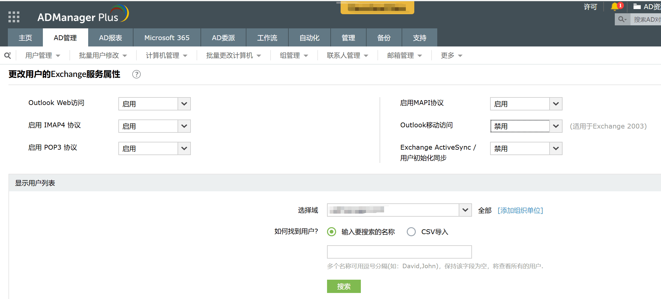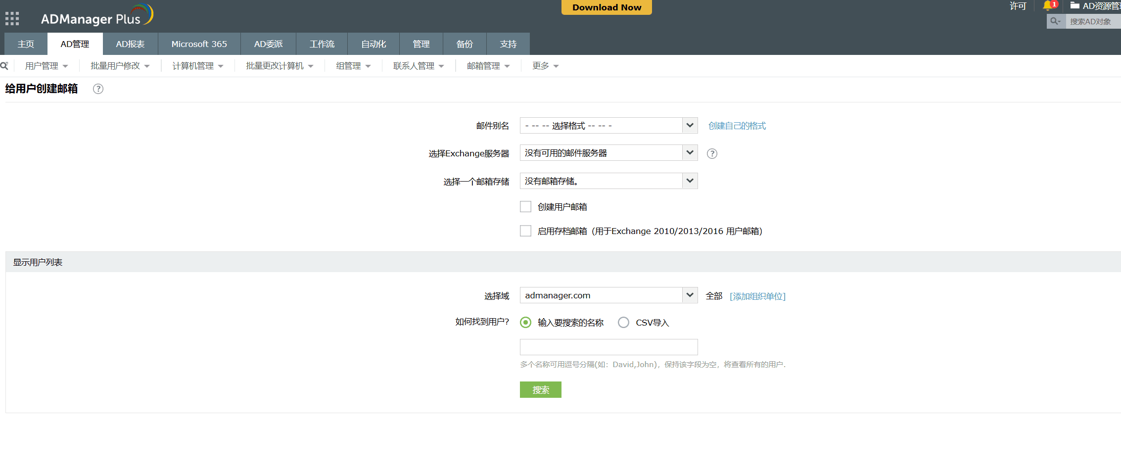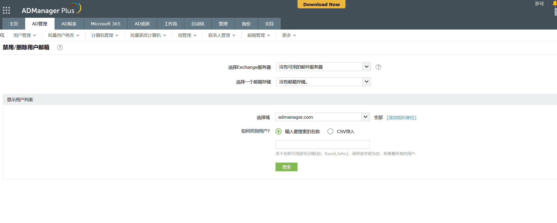 禁用Exchange邮箱:与传统/本机Exchange管理工具不同,此ADManager Plus允许您单击鼠标按钮即可批量禁用多个Exchange邮箱。为了使此任务更加简单,此工具提供了CSV导入选项,使您可以从CSV文件中获取必须禁用邮箱的用户列表。