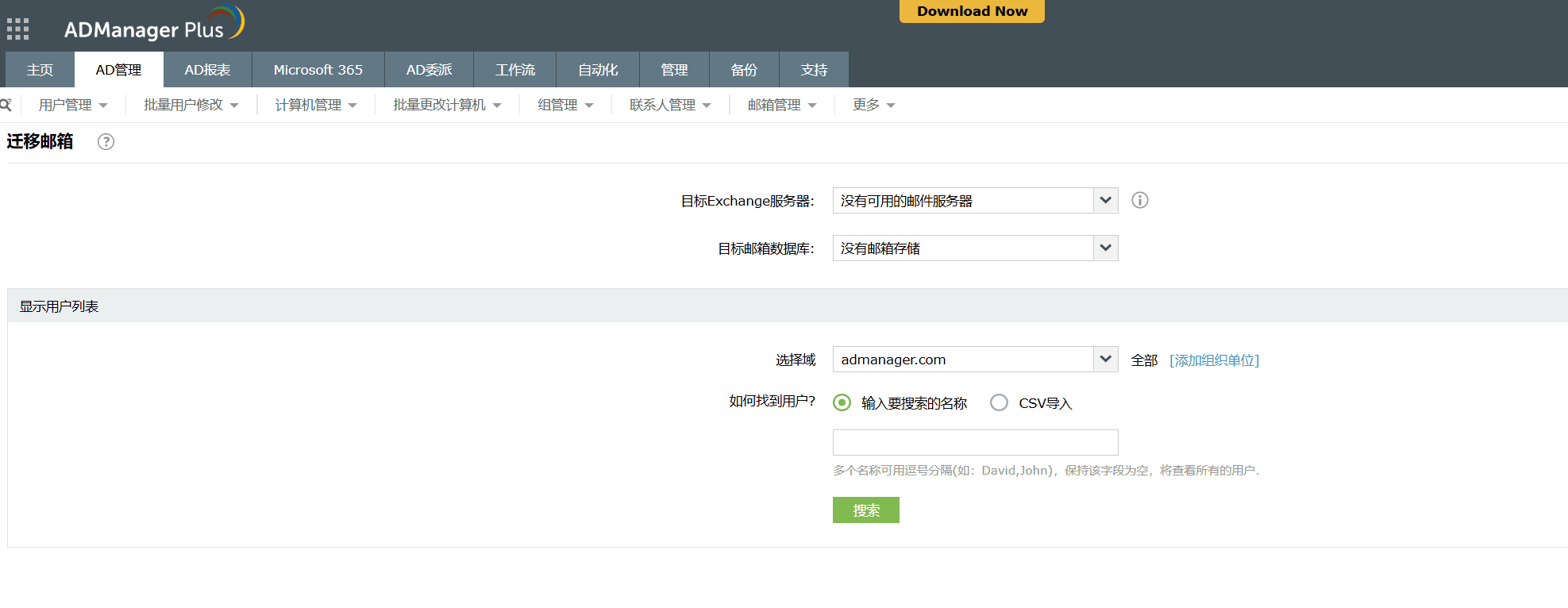 Exchange邮箱迁移: ADManager Plus 通过此功能将将Exchange邮箱从一个版本迁移到另一个版本的复杂任务变成了基于UI的简单活动。您所要做的就是选择目标Exchange Server和邮箱存储或数据库,并指定必须迁移其邮箱的用户。指定的邮箱将被移到新版本的Exchange Server。迁移Exchange邮箱就这么简单。