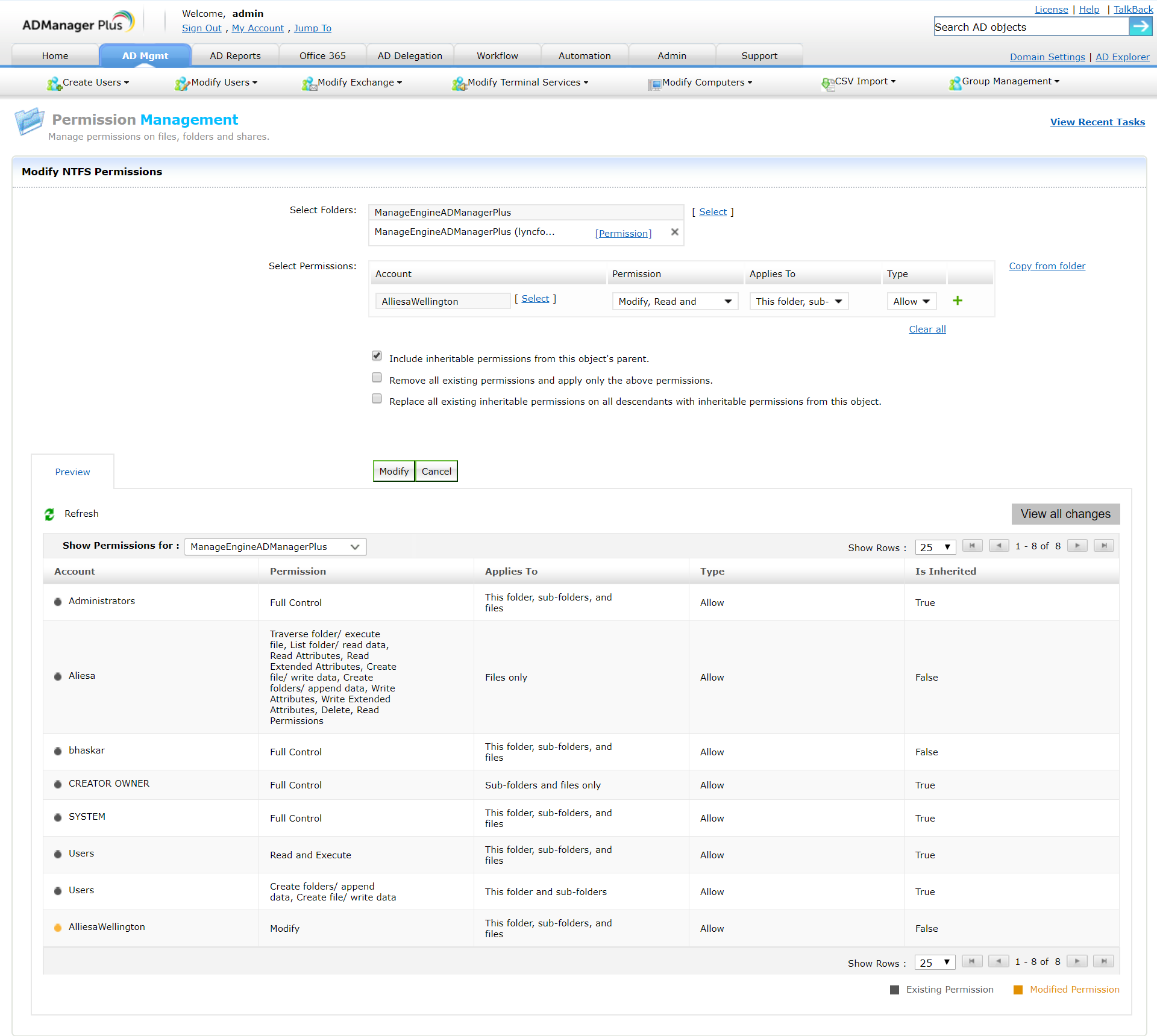 ADManager Plus是基于Web的Active Directory(AD)管理和报表解决方案,将端到端身份管理解决方案和文件服务器权限管理软件的功能组合到一个控制台中。使用ADManager Plus,您可以一次管理多个文件夹和文件的访问权限,也可以为单个文件和文件夹精细地分配权限。