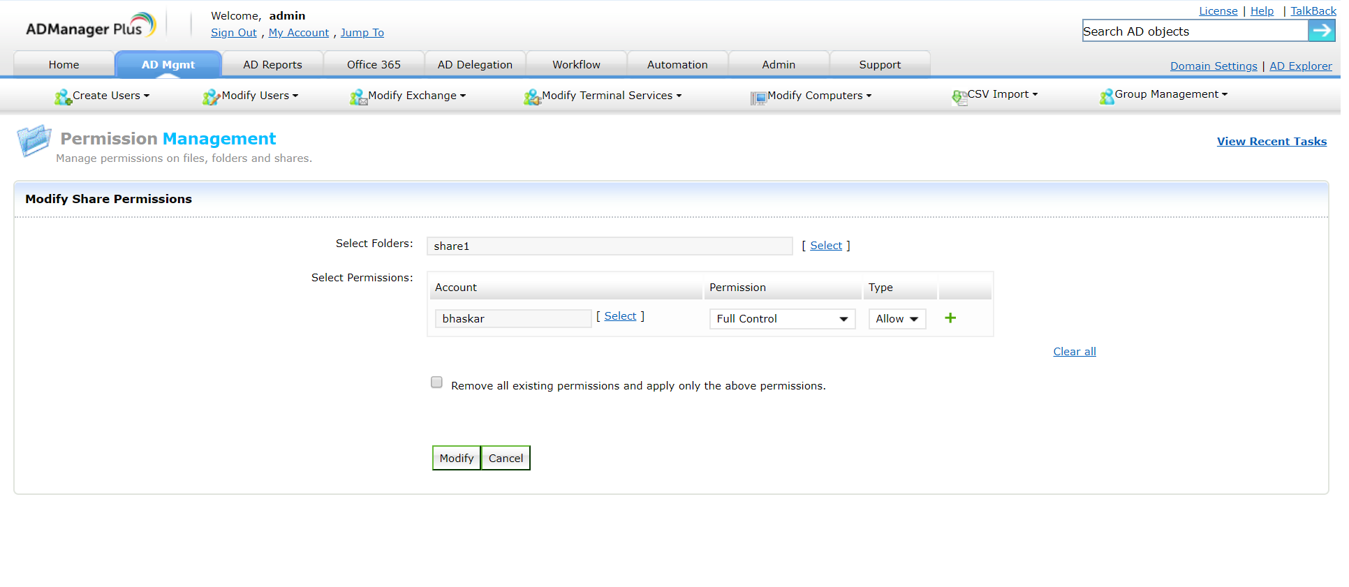 而不是一个接一个地为多个文件夹的相同用户帐户分配相同的权限,而是执行权限的批量管理。使用ADManager Plus可一次将多个文件夹的权限分配给多个用户帐户。