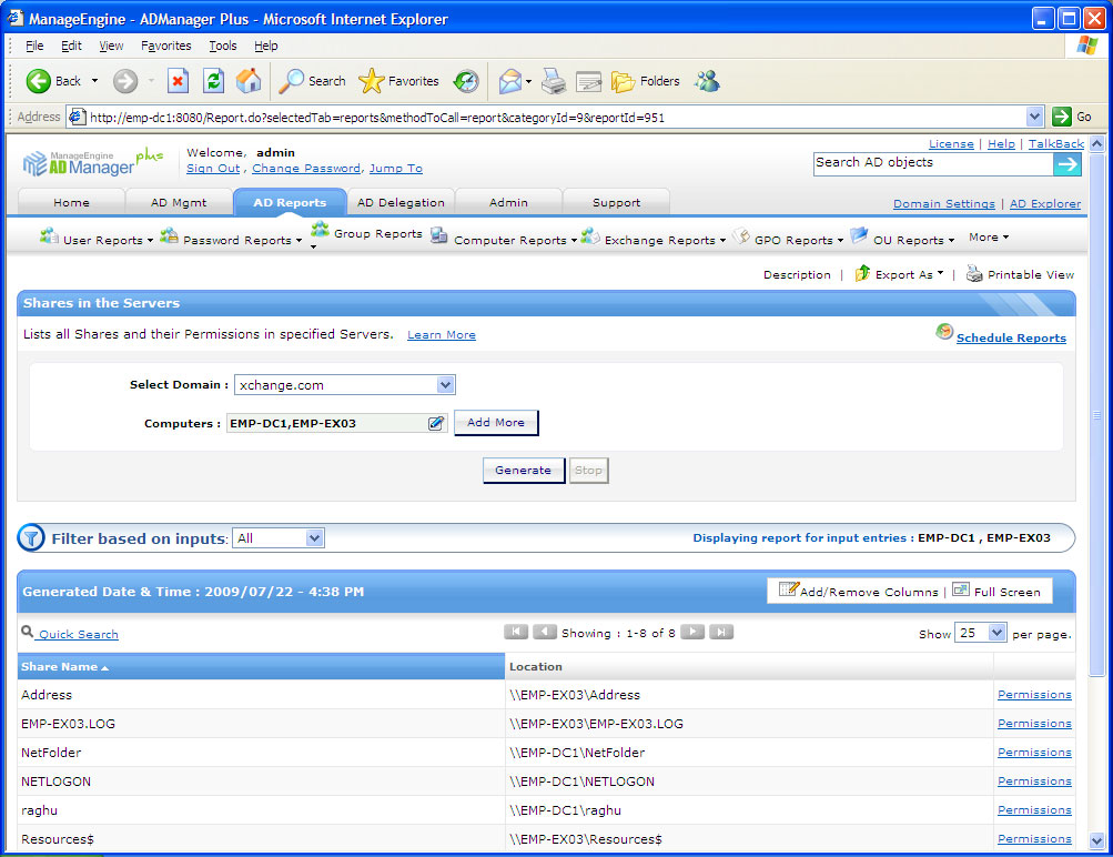 共享是可由多个用户访问的文件和文件夹的通用储存库。管理NTFS共享很重要,以确保它免于未经授权访问。ADManager Plus通过提供其服务器上存在的所有共享的详细共享和访问权限报表,帮助管理员管理其共享。这些共享报表帮助管理员清楚地查看其Windows文件夹共享的访问权限。