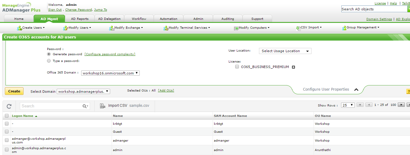 使用ADManager Plus轻松在Office 365中配置多个AD用户。只需导入CSV文件以指定AD用户,该工具就会将这些用户的必需属性发送到基于Azure Active Directory的Office 365以创建其Office 365帐户。