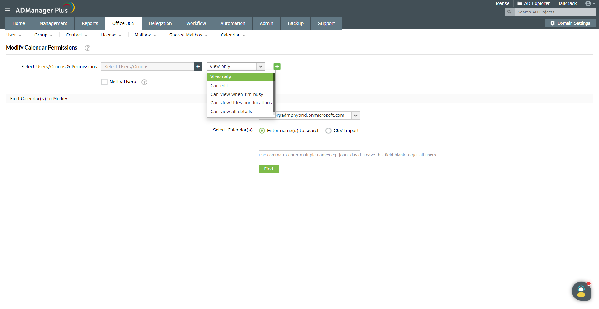 如何使用ADManager Plus修改Office 365日历权限:
