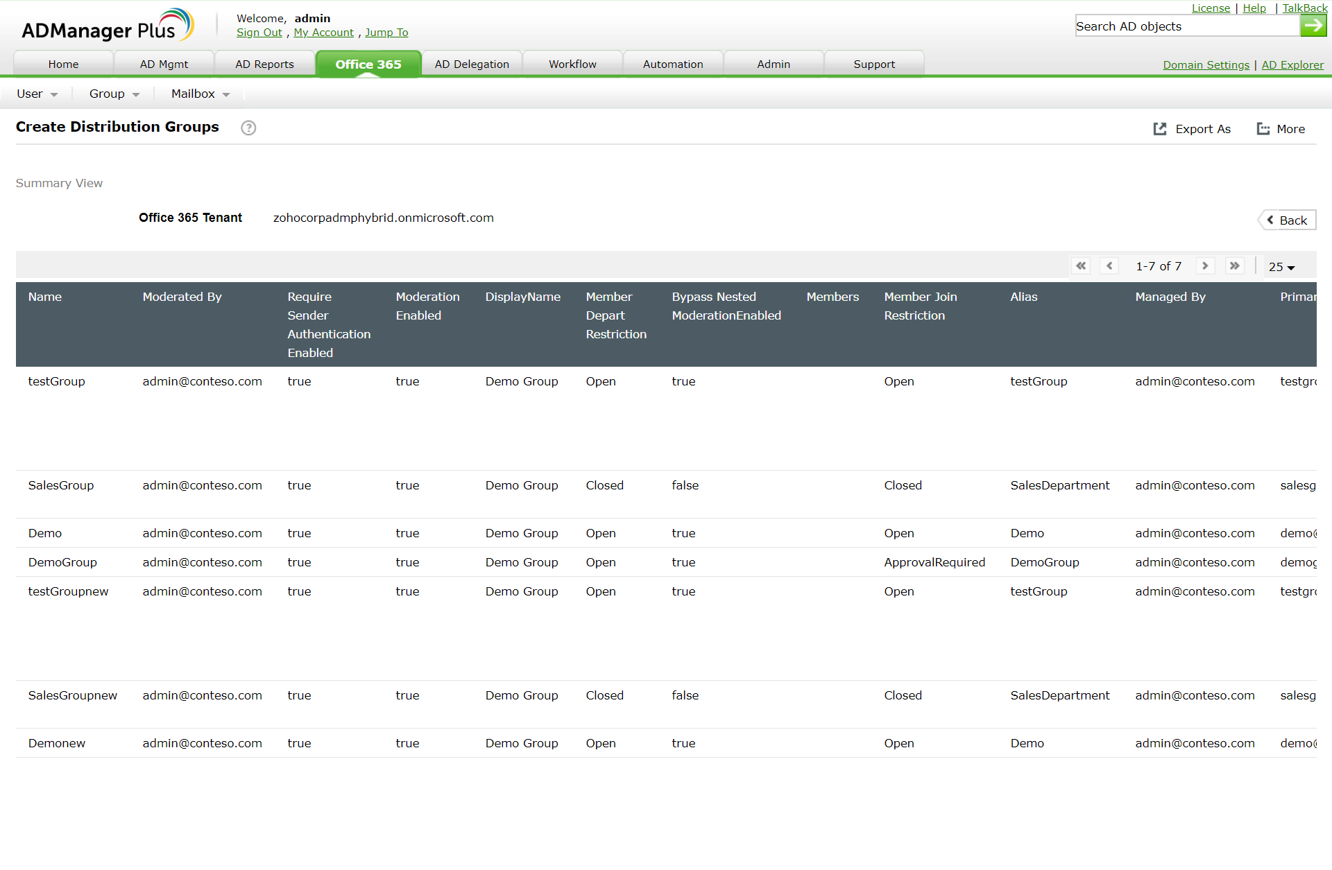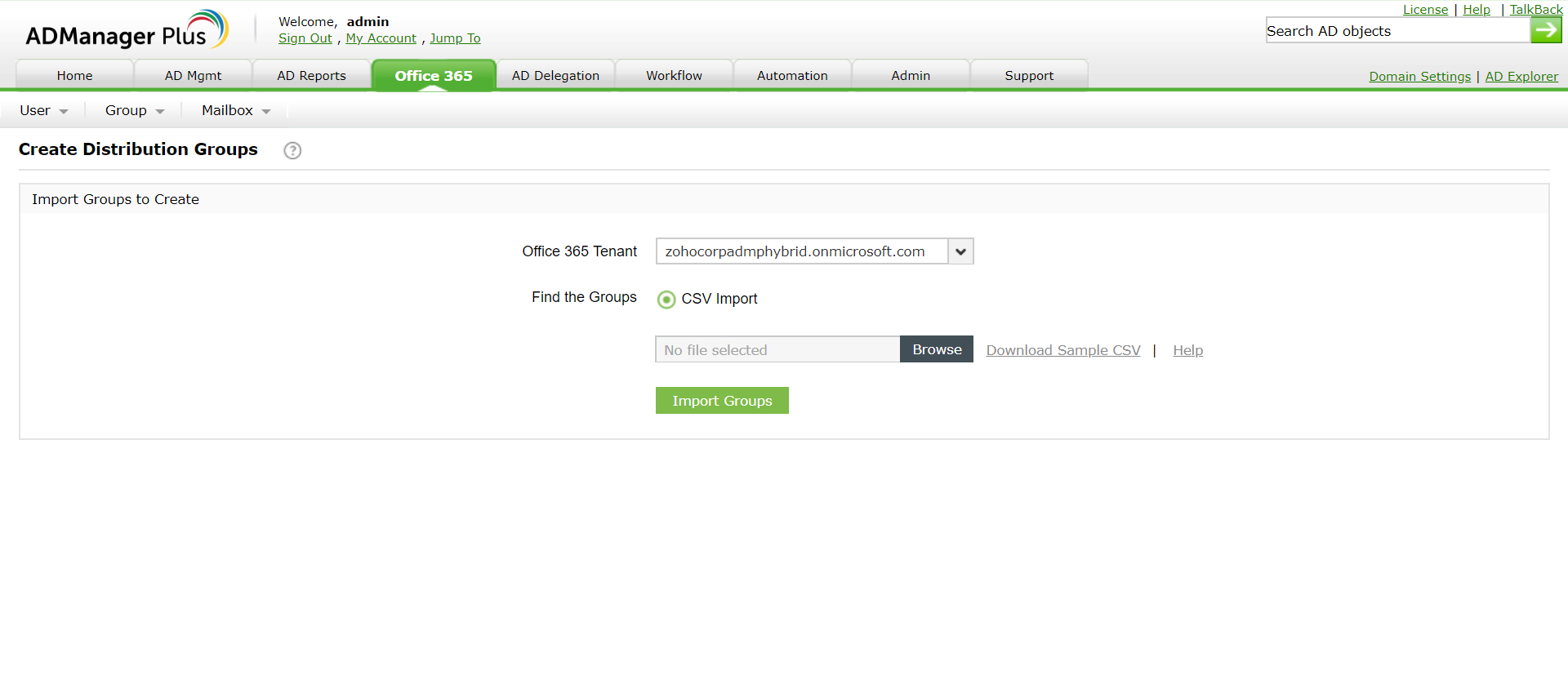 借助ADManager Plus,您可以使用CSV文件在Office 365中使用所有必需的设置批量创建组。除此之外,您还可以管理Office 365用户,许可证,邮箱和组。ADManager Plus还提供有关Office 365用户的报表的独占报表,以查找其上次登录时间,帐户状态以检查他们是否处于活动状态/非活动状态,以及其安全性和通讯组的成员身份,许可证信息等。