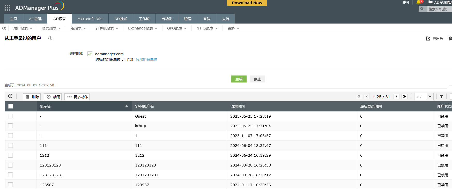 从未登录过的用户报表提供一次也没有登录过域的所有用户的列表。在用户至少登录过一次之前,用户的最后一次登录时间不会在域中更新。从未登录过的用户报表基于Active Directory的这一特性来生成。