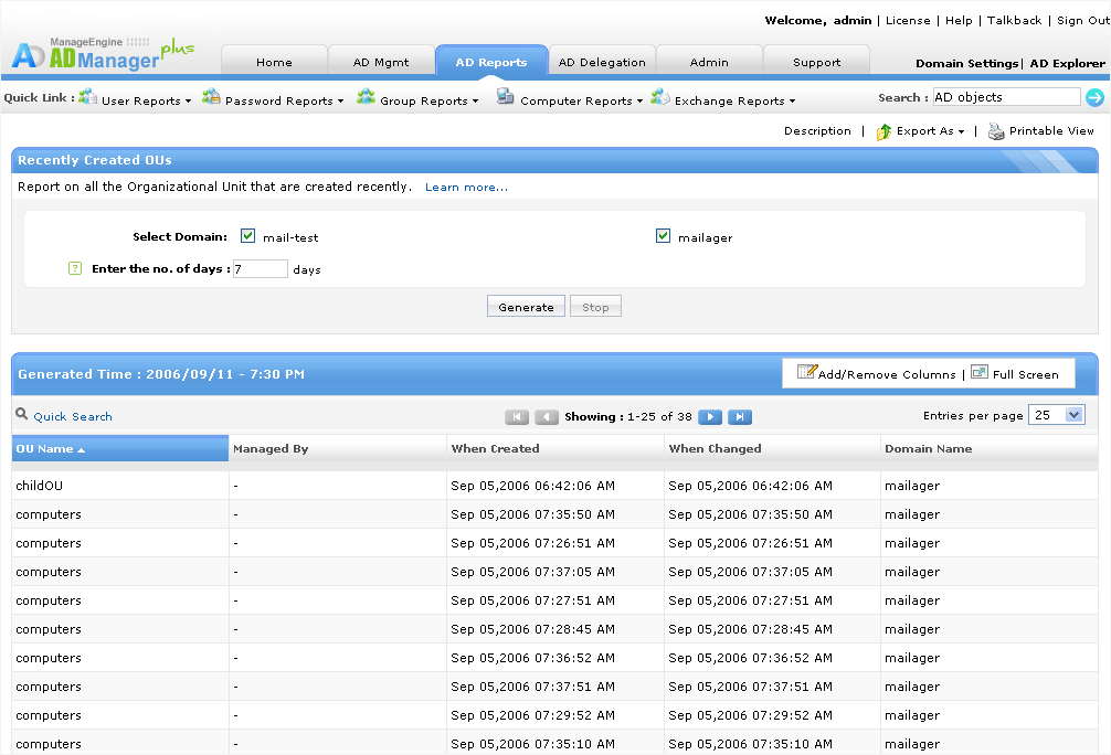 ADManager Plus的组织单位报表让管理员可以很好地了解组织单位、空组织单位、已更改/已修改的组织单位。只需点一下鼠标即可生成和导出所有这些报表。