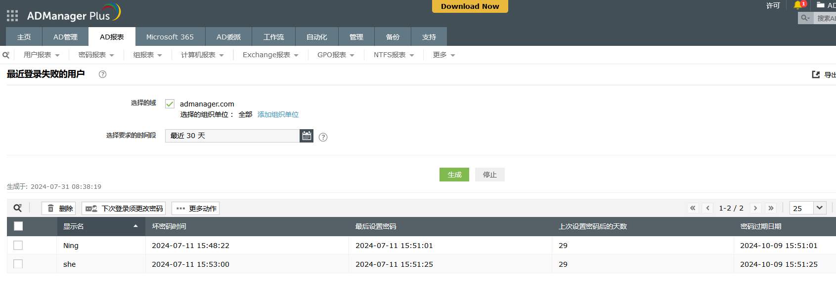 ADManager Plus - 来自ManageEngine的Active Directory管理和报表解决方案,解决了与密码管理相关的问题。为了克服使用本机AD工具、PowerShell等产生的困难,这个实用工具拥有一个内置的密码报表模块,它可提供有关所有Active Directory用户及其密码属性的最新信息,并导出为简单和易理解的格式。使用这些报表,您可以跟踪已修改的密码、密码状态和预先通知用户有关其密码的过期情况。