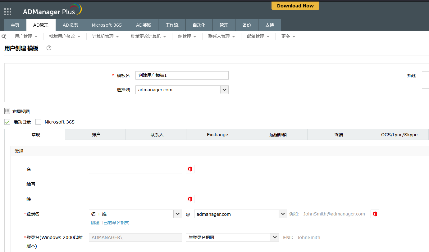 使用ADManager Plus的账户创建模板,只需点击一下即可创建带有所有必需属性的Active Directory账户。为简化创建新账户的过程,这个基于web的Active Directory管理工具提供不同类型的模板,例如: