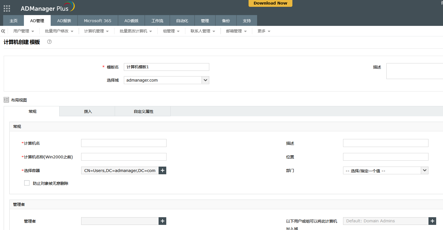 与用户配置模板类似,计算机创建模板让您只需一步即可在Active Directory中创建具有所有必需属性的新计算机账户。这些模板也可用于存储和配置计算机属性的标准值,例如: