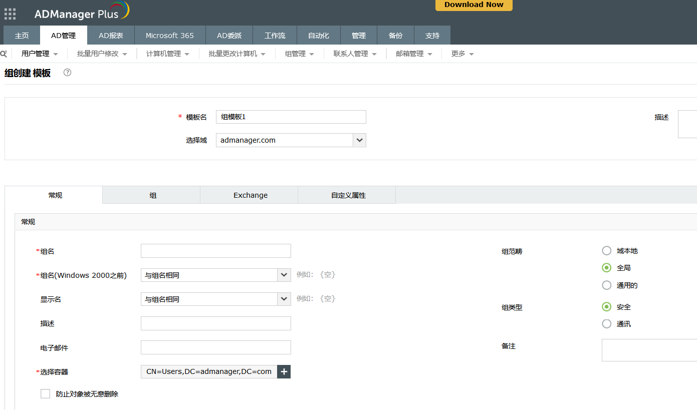 Active Directory组创建模板可带来管理优势,因为它们通过其与众不同的功能让组配置变得简单,可以配置新组及所有适合的属性或设置,还可以一次性将成员添加到组中。换句话说,只需在创建组时应用适合的组创建模板,您就可以配置: