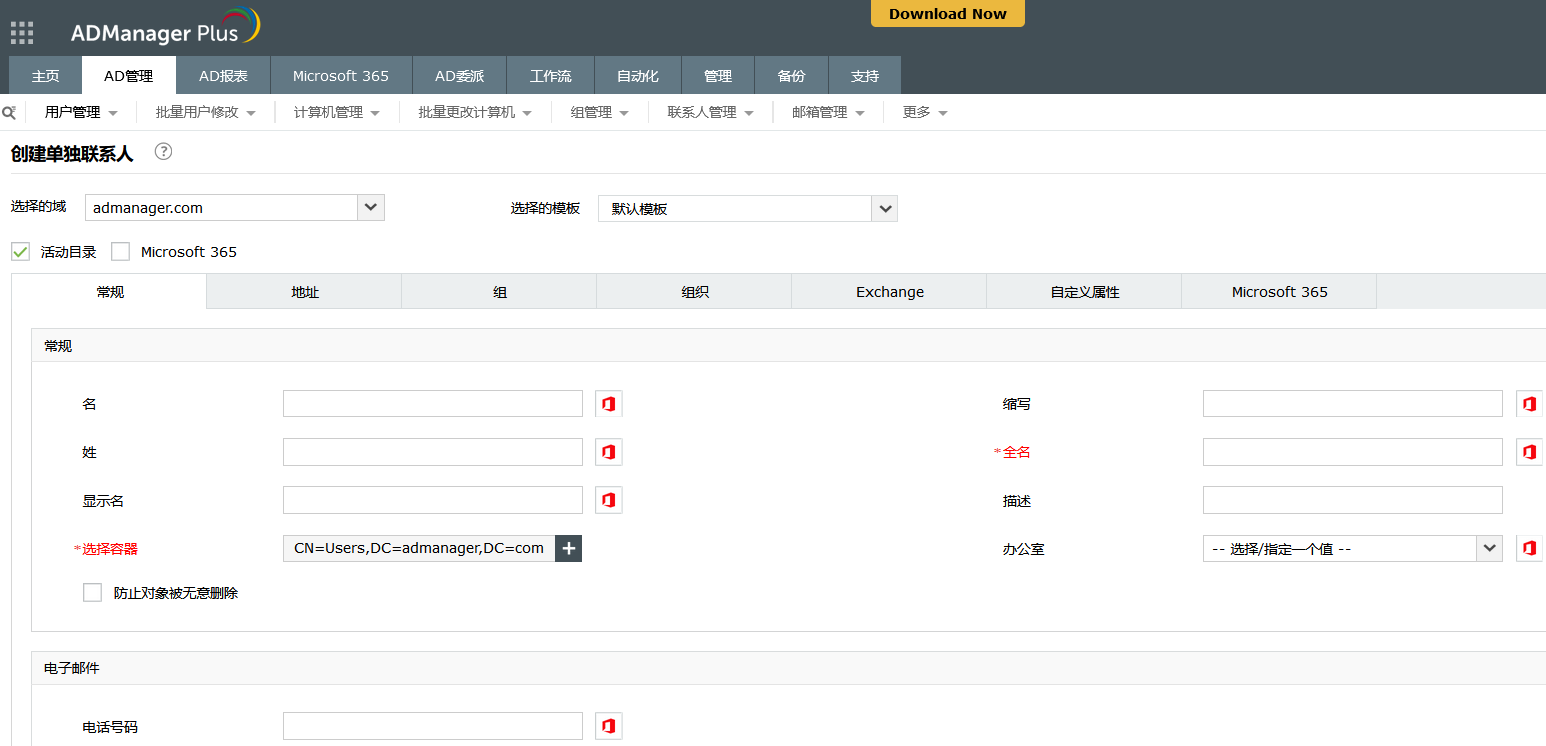 联系人创建模板使得在Active Directory中创建新联系人的过程得以简化和加快。它们帮助您一步创建具有所有必需设置的联系人。此外,这些模板还让您可以保存多个联系人共有的属性值,并在创建新联系人时重复使用它们。