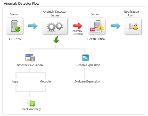 当发现关联到属性的配置文件及属性的历史值违反关联的异常检测配置文件时,即基于配置触发告警。例如:你可以创建一个规则,当短期最后一个小时平均值大于6小时的移动平均值的两倍的时候产生异常。相应地可以设置严重和警告告警。