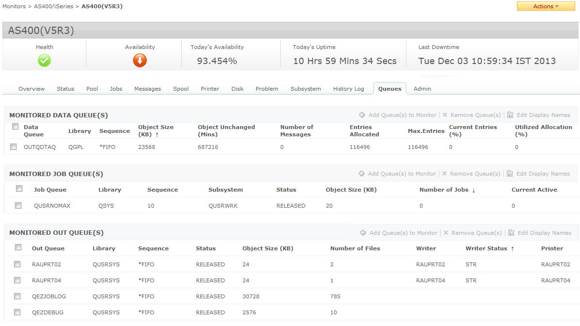 Users will be able to execute the actions like add queues to be monitored and remove queue from being monitored. You can also configure alarms for queues in the AS400 server and even make quick edits. Applications Manager's IBM AS400/iSeries monitor enables you to manage and monitor your server's availability and performance.
