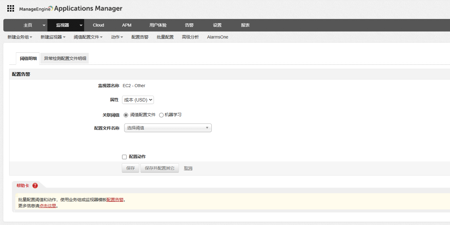 当预算超出特定值时,Application Manager会通知您,从而帮助您控制预算。您可以为各种成本属性设置阈值,例如单个服务成本、逐月支出、预测成本、逐月服务成本和逐月税收。只要超过设置的值,就会收到警报。