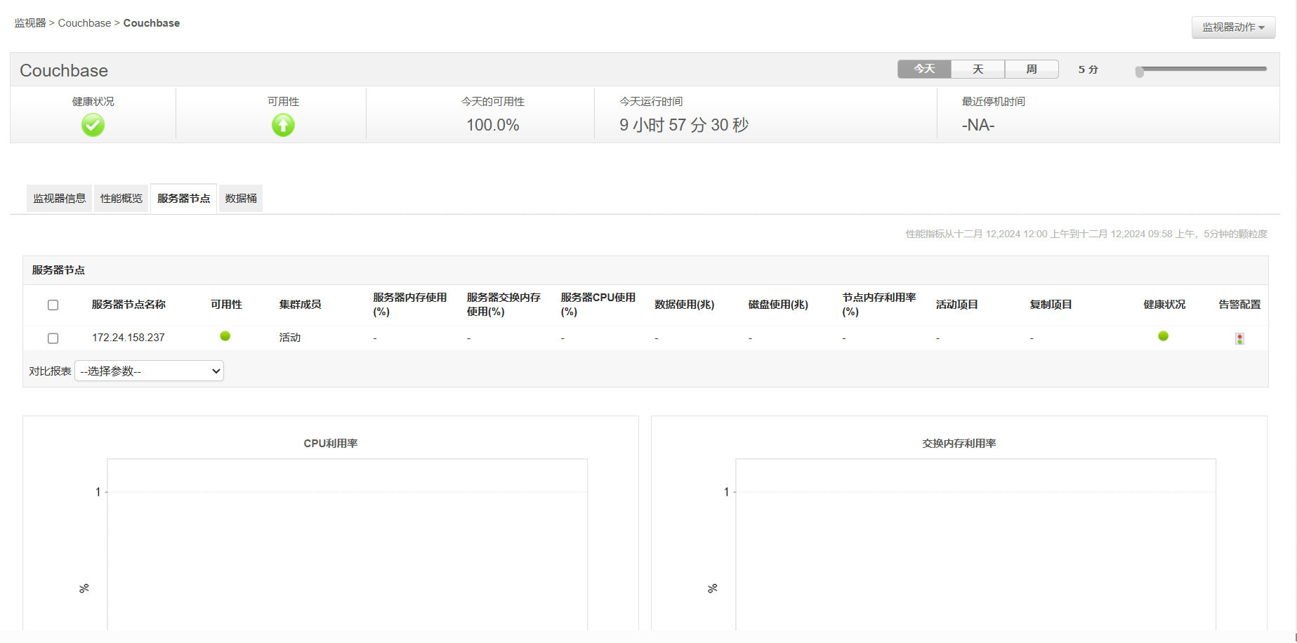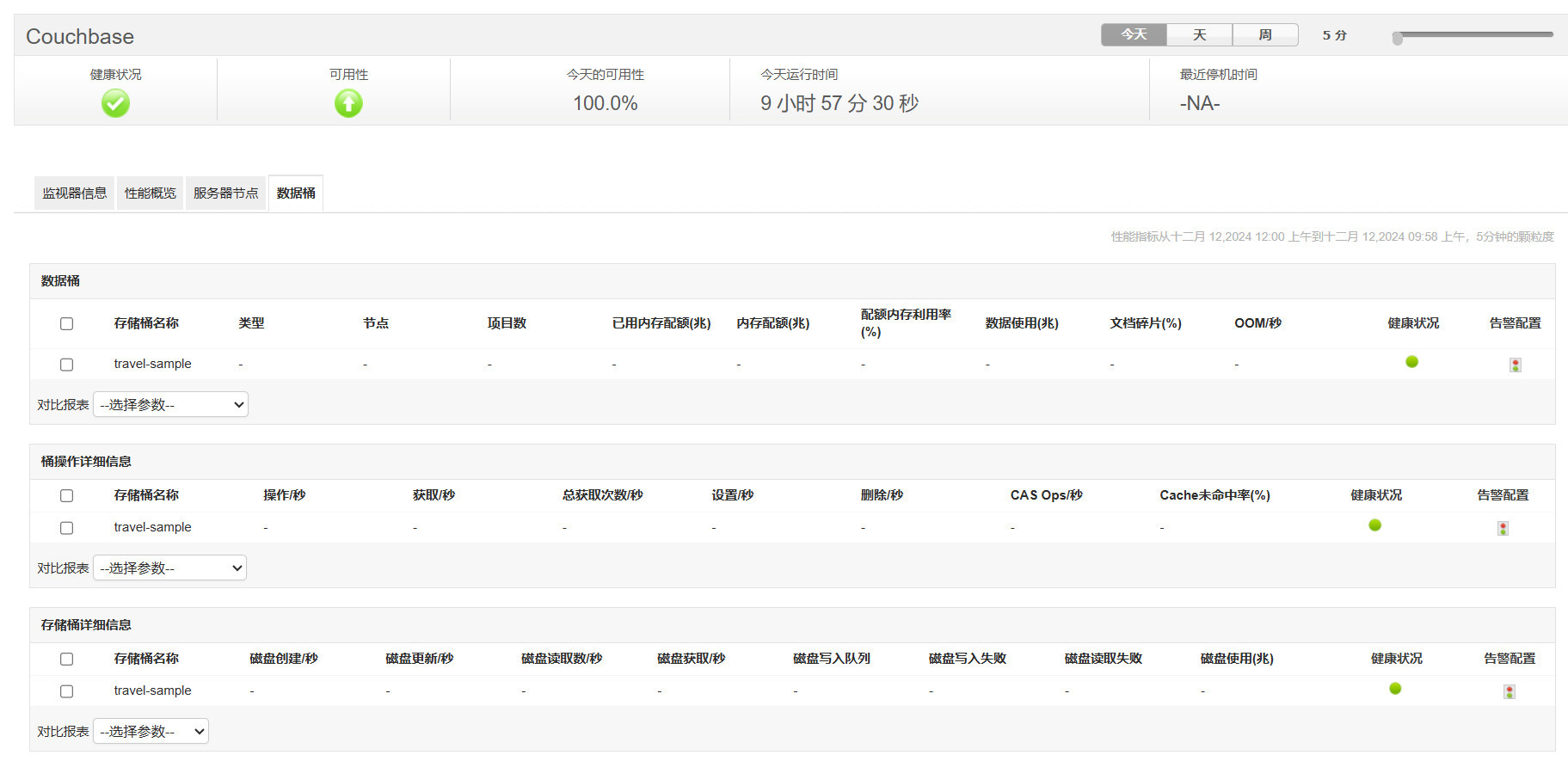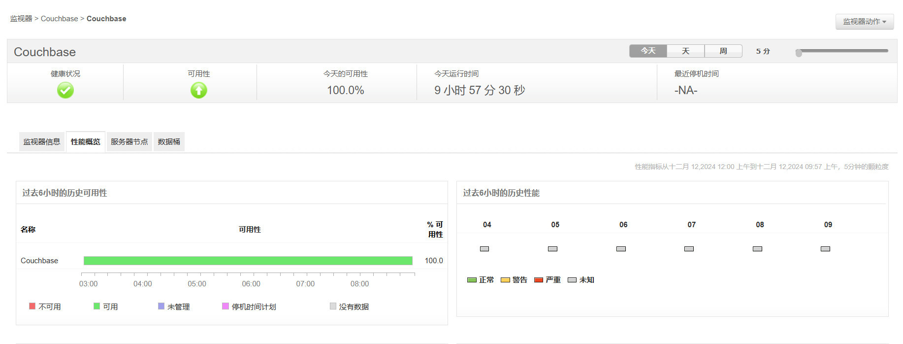 监控 Couchbase 集群的健康状况和可用性,并获取重要信息,例如 Couchbase 服务器的性能历史以及正常运行/停机时间。确定客户端请求是否正确处理,并在服务器容量不足时收到通知。