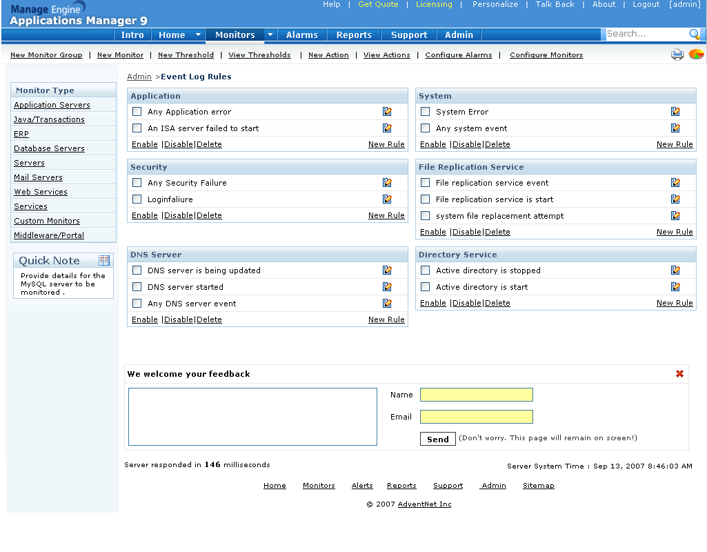 ManageEngine Applications Manager可用于监控各种Windows事件。通过配置事件日志规则可以生成告警。